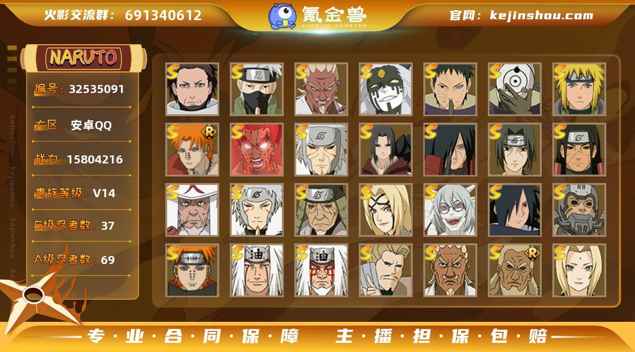 安卓QQ-v14-1580w战力成品超哥号-十多个直购a忍-本期忍法帖已买-买到就是赚到-S忍者数:37- A忍者数:69宇智波带土「暴怒」(2星)宇智波带土「漂泊浪客」(2星)纲手「妖怪奇谭」(2星)旗木卡卡西「万花筒写轮眼」(2星)宇智波止水「新春限定」(2星)猿飞阿斯玛「七夕限定」(2星)宇智波鼬「新春限定」(2星),小南「新春限定」(2星),小南「夏日泳装」(2星),照美冥「夏日泳装」(2星) 【S级忍者】宇智波带土「忍界大战」(3星),宇智波斑「木叶创立」(3星),迈特凯「死门」(3星),旗木卡卡西「须佐能乎」(3星),烈斗「初代目风影」(3星),宇智波斑「秽土转生·解」(3星),大筒木桃式(3星),神秘面具男「红夜之刃」(3星),艾「忍界大战」(3星),春野樱「忍界大战」(3星),千手柱间「秽土转生」(3星),波风水门「九喇嘛连结」(3星),宇智波斑「白面具」(3星),药师兜「仙人模式」(3星),千手扉间「秽土转生」(3星),宇智波斑「秽土转生」(3星),自来也「舞之豪杰」(3星),宇智波鼬「秽土转生」(3星),佩恩·天道「超」(3星),自来也「仙人模式」(3星),宇智波带土「十尾人柱力」(3星),宇智波鼬「须佐能乎」(4星),漩涡鸣人·宇智波佐助(3星),艾「四代目雷影」(3星),佩恩「天道」(3星),千...