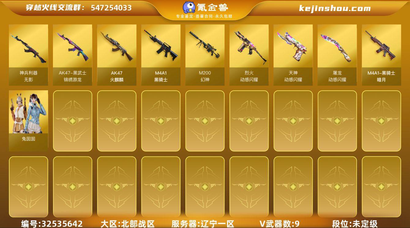 辽宁一区-15V-1王者武器数-0炫金武器数 【热门武器】:M200-幻神,M4A1-黑骑士 【皮肤】:黑骑士-暗月 【角色】:乔伊教练,云海玲珑,初恋灵狐,风暴女,虎妞,嘉年华灵狐,卡塔琳娜,猎狐者-追月,灵狐者-X,龙儿,麻雀,曼陀罗-X,潘多拉-X,潘多拉-甜心教官,潜龙队-X,斯沃特-X,兔囡囡,新娜塔莎 【人偶武器】:AWM-灵狐-15周年嘉年华,海滩汪汪-巴雷特,迷你波特博士,生化手雷-机甲核心*2,巴雷特-赏金猎人,灵狐娃娃手雷 【暴走生化】:黑龙吞噬者,双面神,超级对讲机 【挑战大师】:神圣爆裂者-末日III*3 【英雄级武器】:AK47-火麒麟,M4A1-黑骑士,无影-神兵利器,黑武士-锦绣游龙,烈火-动感闪耀,王者之鲨-觉醒版,M200-幻神,天神-动感闪耀,屠龙-动感闪耀,手雷-动感闪耀,AK47-竞魂无影,AN94-竞魂超新星 【源级武器】:源·火麒麟,源·雷神,魂·雷神-神秘按键,魂·雷神-新春神龙,魂·雷神-15周年嘉年华,M4A1-十二生肖·龙-雷神,源·黑骑士,魂-死神-机甲核心,源·机械迷城,魂·龙血-锋芒破茧,金色蔷薇-狼王,魂·QBZ03-金色蔷薇-萌杀,源·玫瑰精灵,源-极光,Barrett-极光-掌火,源·天龙,AWM-裁决-百城联赛天津,魂·裁决-凤灵,魂·裁决-新人王绿豆,魂·毁...