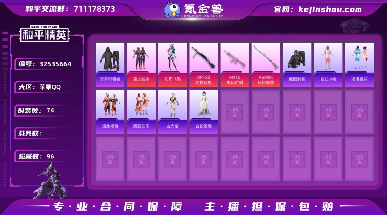【938236】DYH18091【2粉装-5特效枪 奇异狩猎者 小螳螂 金羽特工背包头盔全套】苹果手Q-2粉装-5特效枪-74套装-96枪皮-5王牌印记-荣耀皇冠Ⅰ-31473热力值 【2粉装】幻影飞狐,星之彼岸【5特效枪】Mk14-福马献瑞[5级],DP-28-豹影疾电[5级],M416-电玩时刻[5级],Kar98K-巳巳如意[3级],UMP45-萌骑冒险[5级]【2稀有】奇异狩猎者,AWM-黄金龙骨【4飞行器】炫彩糖果飞行器,拂晓神骑飞行器,星之彼岸飞行器,粉色滑翔尾迹【2头盔】金羽特工头盔,幻影战神头盔【2背包】金羽特工背包,深海小丑鱼背包【161其它衣服和枪皮】黄色伏地魔,猛禽,瑞龙福将,角色-白光莹,冰河战士,红釉青花,耀眼新星,海盐绵绵冰,蓝彩潮人,魅力单车,鹤鸣,热情海星,黄色运动,竞技勇士朋克,音速流光,娇憨猪猪,SS29特训,炫蓝之夏,长空猛禽,SS18特训,空投萌叽,角色-Mark.06,炫彩糖果,鹰眼刺客,龙魂突击队,SS21特训,SS27特训,红色运动,SS22特训,星梦畅游,纯真浪花,SS7特训,酷潮明星,猎鹰,海龙战士,战术大师,云霞荷露,SS34特训,飞驰魅影,蓝色运动,都市漫游者,夏日音浪,粉红小猪,霓虹街区,SS31特训,浪漫樱花,湖蓝色名流,黄色名流,蓝色守护者,燕燕于飞,旋风灵鼠,SS20特训,萌趣咩咩,街头潮人,SS17特训,竞技名士,青涩时光,狙击之神...