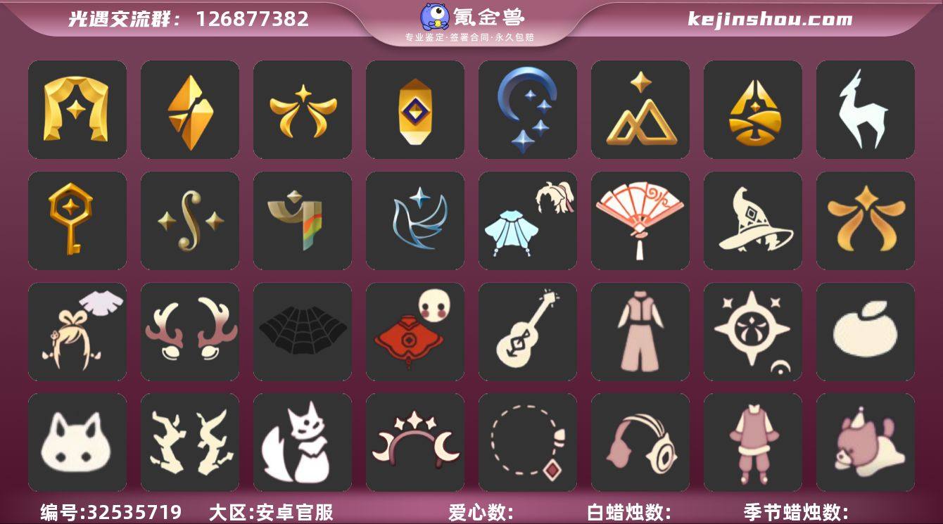 账号类型: 手机账号 季节已毕业: 表演季,破晓季,欧若拉季,夜行季,追忆季,拾光季,归巢季,九色鹿季,筑巢季,二重奏季,彩染季,青鸟季 完成地图: 无 珍稀物品: 白枭,透明蝶翼斗 礼包: 巫师,欧若拉之翼,绊爱,鹿角,蜘蛛斗,福娃,吉他,奔跑裤子,人声乐器,橘子,兔子,枯角,猫背饰,星月头饰,彩虹耳钉,彩虹耳机,新年裤,奥利奥,海螺,四叶草,新年耳钉,献瑞折扇礼包,青衫落拓礼包 裤子: 武士裤,背带裤,白棉裤 面具: 黄鼠狼 面饰: 红耳机,黑框眼镜 项链: 围巾 发型: 正太,公主头,虚荣,猫耳,白枭 斗篷: 红金,白鸟斗 配饰: 雨伞,吉他,笛子,大铃铛乐器 亮点: 重塑药水81