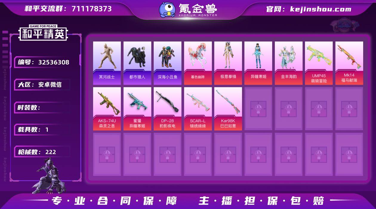 【1载具 7特效枪 3粉装 222枪皮 187套装】18印记,木乃伊,暮色幽蹄,都市,套装-都市猎人,套装-浪漫天命,套装-沙漠毒蛇,套装-金耀舞者,套装-深海小丑鱼,套装-小丑鱼,套装-冥河战士,角色-军刀雅典娜,角色-Mark.06,套装-金丰海韵,角色-异瞳寒姬,套装-极意拳锋,SCAR-L-锦绣绵绵,蜜獾-异瞳寒姬,Kar98K-巳巳如意,Mk14-福马献瑞,UMP45-萌骑冒险,AKS-74U-森灵之息,DP-28-豹影疾电,编号:JJIMN31
