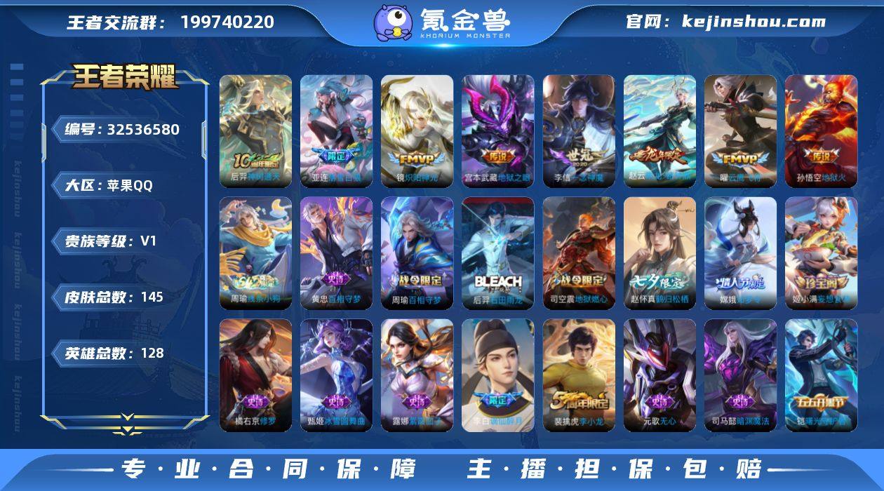 【男神打野号·落雪白狼··铭钟鼎·炽阳神光·一念神魔·】苹果Q-V0-至尊星耀I段位-128英雄-145皮肤-8传说-47史诗 【英雄全皮】:孙权全皮,敖隐全皮 【传说皮肤】:后羿神树通天,亚连落雪白狼,赵云乘龙铭钟鼎,镜炽阳神光,曜云鹰飞将,李信一念神魔,宫本武藏地狱之眼,孙悟空地狱火 【限定皮肤】:李白谪仙醉月,狄仁杰阴阳师,赵云皇家上将,元歌无心,狄仁杰魔术师,项羽海滩派对,百里玄策原初追逐者,裴擒虎李小龙,嫦娥如梦令,艾琳流音漫舞,赵怀真鹤归松栖,司空震地狱燃心,阿古朵江河有灵,张良古海寻踪,高渐离燃音魔法,妲己灵卜魔法,鬼谷子天穹祈灯,姬小满妄想食味,赵云乘龙铭钟鼎,百里玄策超元猎域,亚连落雪白狼,沈梦溪龙舞盛年,鲁班七号蔬乡物语,李元芳蔬乡物语,刘邦剑破天穹,程咬金群星魔术团,刘备异域游侠 【年限皮肤】:赵云乘龙铭钟鼎 【赛季限定】:张良古海寻踪,鬼谷子天穹祈灯,刘邦剑破天穹,东皇太一噬灭天穹,钟馗虚灵犬护,甄姬逆浪荇歌,亚瑟荣光之誓,百里玄策原初追逐者 【战令限定】:司空震地狱燃心,艾琳流音漫舞,高渐离燃音魔法,妲己灵卜魔法,鲁班七号蔬乡物语,李元芳蔬乡物语,周瑜百相守梦,孙策百相守梦,周瑜线条小狗 【...