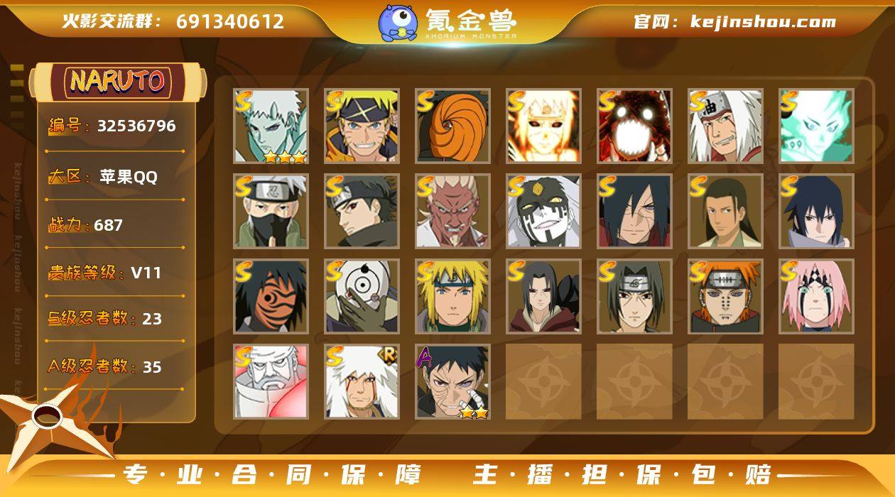 实名: 可修改 贵族等级: V11 S忍数: 23 A忍数: 35 战力值(万): 687 S级忍者: 宇智波鼬「秽土转生」,佩恩「天道」,波风水门,宇智波鼬 「须佐能乎」,自来也 「舞之豪杰」,宇智波斑「白面具」,大筒木金式「博人传」,春野樱 「忍界大战」,神秘面具男 「红夜之刃」,宇智波佐助「永恒万花筒」,千手柱间·木叶创立,宇智波斑「秽土转生·解」,大筒木桃式,艾「忍界大战」,宇智波止水「须佐能乎」,旗木卡卡西「须佐能乎」,大筒木舍人 「最终章」,自来也 「传说中的三忍」,漩涡鸣人 「暴怒·第六尾」,波风水门「九喇嘛连结」,宇智波斑「五影会谈」,漩涡鸣人·宇智波佐助,宇智波带土「十尾人柱力」 亮点: 【优质装备】:宇智波鼬「秽土转生」,宇智波斑「白面具」,大筒木金式「博人传」,春野樱 「忍界大战」,神秘面具男 「红夜之刃」,宇智波佐助「永恒万花筒」,千手柱间·木叶创立,宇智波斑「秽土转生·解」,大筒木桃式,艾「忍界大战」,宇智波止水「须佐能乎」,旗木卡卡西「须佐能乎」,大筒木舍人 「最终章」,自来也 「传说中的三忍」,漩涡鸣人 「暴怒·第六尾」,宇智波带土「漂泊浪客」