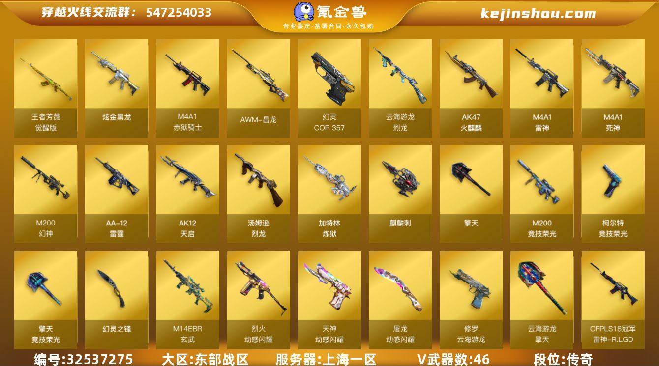 【ky5441】上海一区-50V-1王者武器数-1炫金武器数 【热门武器】:M14EBR-玄武,M200-幻神,M200-竞技荣光*2,汤姆逊-烈龙,加特林-炼狱,裁决-雪莉杨,USP-雷暴,COP 357-幻灵 【王者炫金武器】:炫金黑龙 【音效卡】:修罗-云海游龙音效卡 【皮肤】:雷神-R.LGD-CFPLS18冠军*2,火麒麟-雷神,毁灭-黑大圣皮肤,修罗-星空 【角色】:电竞教官-云悠悠,战地猎狐,王者影豹,乔伊教练,云海玲珑,初恋灵狐,风暴女,虎妞,龙儿-小淘气,麻雀,潘多拉-X,斯沃特-X 【人偶武器】:裁决-雪莉杨,Barrett-云海玲珑 【挑战大师】:激光毁灭者III-白马银枪,试炼破坏者III 【英雄级武器】:AK47-火麒麟,M4A1-雷神*2,M4A1-死神,AK12-天启,M14EBR-玄武,烈火-动感闪耀,王者芳薇-觉醒版,M200-幻神,M200-竞技荣光*2,加特林-炼狱,汤姆逊-烈龙,烈龙-云海游龙,AA-12-雷霆,USP-雷暴,COP 357-幻灵,柯尔特-竞技荣光*2,天神-动感闪耀,修罗-云海游龙,擎天,麒麟刺,幻灵之锋,擎天-竞技荣光*2,屠龙-动感闪耀,擎天-云海游龙,高爆手雷-幻灵*4,高爆手雷-竞技荣光,手雷-动感闪耀,手雷-云海游龙,闪光弹-幻灵*3,闪光弹-竞技荣光*2,烟雾弹-幻灵*3,烟雾弹-竞技荣光*2,M4A1-赤...