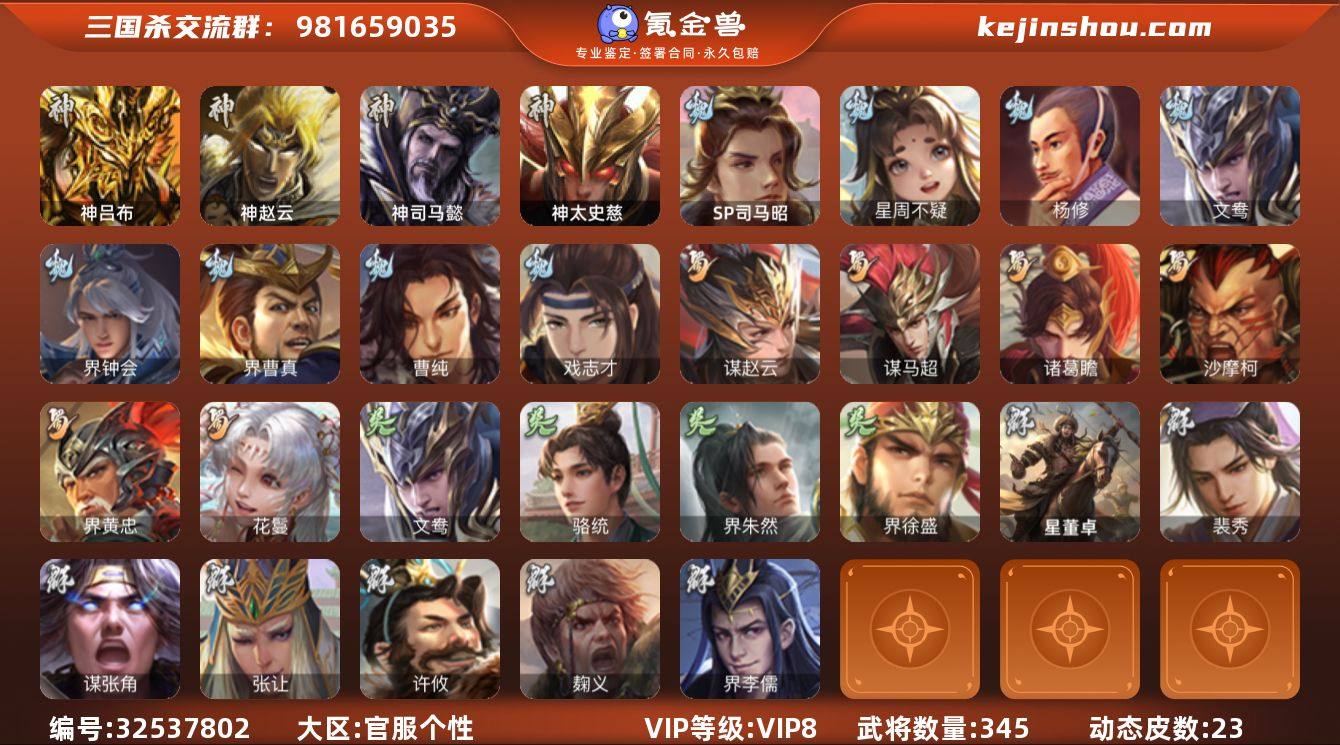 【2337】官阶:大将军;VIP等级:VIP8;史诗武将数量:31;动态皮肤数量:23;武将总数:345;史诗宝珠数量:45;将魂数量:4480;神将:6;魏国史诗武将:18;蜀国史诗武将:6;吴国史诗武将:3;群史诗武将:11