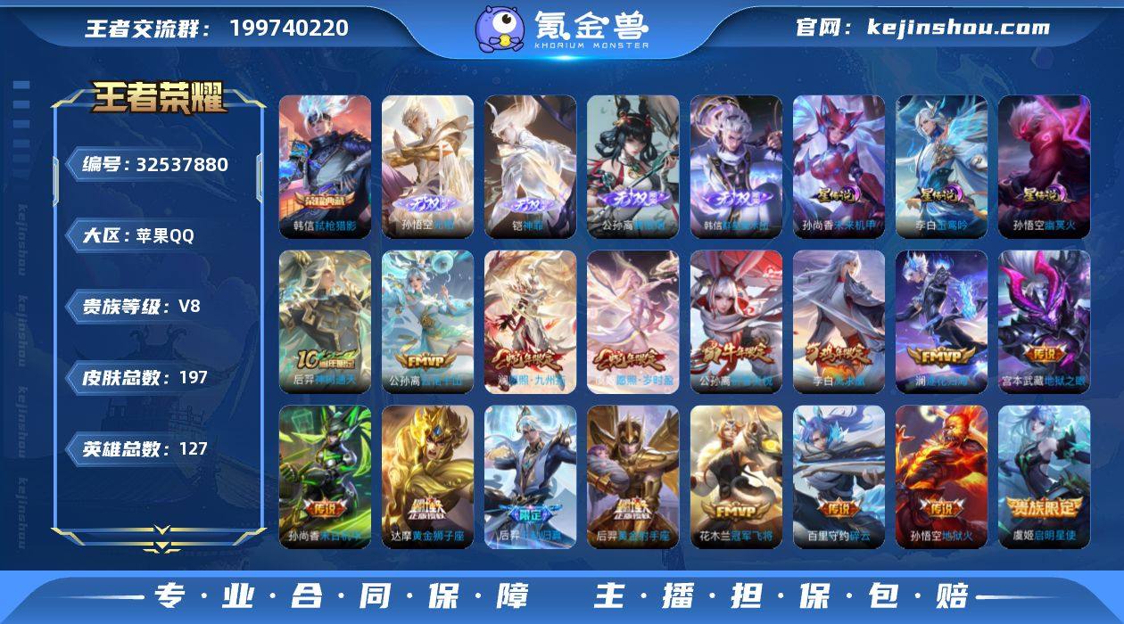 【高性价比·4无双·1小兵·弑枪猎影·离恨烟·韩信群星魔术团·无相·神罪·玉鸾吟·小兵雪境奇遇·祈雪灵祝·千劫归真·愿照九州拓·愿照岁时盈·凤求凰·可二次】YXw20728-苹果Q-127英雄-197皮肤-9王者印记-102铭文-贵族积分8w【贵族8】【1典藏·4无双·3星传说·16传说·7按键·236幸运值】【因赛季更新游戏段付以上号为准!】 【荣耀典藏】:韩信弑枪猎影 【无双皮肤】:孙悟空无相,铠神罪,公孙离离恨烟,韩信群星魔术团 【星元皮肤】:李白玉鸾吟,孙尚香未来机甲,孙悟空幽冥火 【小兵皮肤】:小兵雪境奇遇 【传说皮肤】:后羿神树通天,公孙离云诺千山,后羿千劫归真,澜愿照九州拓,虞姬愿照岁时盈,澜逐花归海,百里守约碎云,公孙离祈雪灵祝,虞姬启明星使,达摩黄金狮子座,花木兰冠军飞将,后羿黄金射手座,李白凤求凰,孙尚香末日机甲,宫本武藏地狱之眼,孙悟空地狱火 【限定皮肤】:公孙离离恨烟,李白谪仙醉月,狄仁杰阴阳师,赵云皇家上将,赵云引擎之心,嬴政白昼王子,孙尚香蔷薇恋人,吕布猎兽之王,狄仁杰魔术师,狄仁杰万华元夜,达摩沙漠行僧,项羽海滩派对,老夫子醍醐杖,程咬金演武夺筹,王昭君凤凰于飞,孙悟空至尊宝,孙悟空孙行者,牛魔御旌,李元芳云中旅人,虞姬...