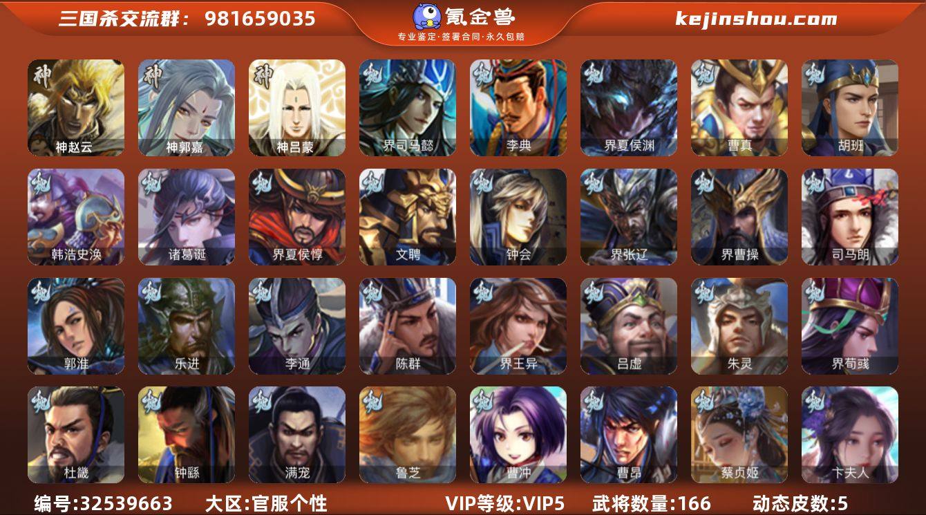 神赵云,神郭嘉,沙摩柯,骆统,司马昭,神吕蒙,SP关羽,SP蔡文姬,乐进,曹昂,诸葛诞,朱灵,文聘,SP姜维,钟会,曹冲,郭淮,满宠,界王异,界曹操,界司马懿,界夏侯惇,界张辽,李典,曹真,韩浩史涣,陈群,钟繇,司马朗,李通,吕虔,鲁芝,界荀彧,杜畿,卞夫人,蔡贞姬,胡班,界夏侯渊,SP孙尚香,关银屏,夏侯霸,马良,廖化,界马岱,关平,刘封,界法正,界关兴张苞,界刘备,界赵云,界马超,SP徐庶,吴懿,周仓,张松,刘谌,夏侯氏,界伊籍,费祎,糜夫人,界周仓,谋庞统,界张嶷,蒋琬费祎,鲁肃,凌操,孙鲁育,程普,韩当,潘璋马忠,虞翻,界甘宁,界黄盖,界周瑜,界大乔,界陆逊,孙鲁班,朱桓,顾雍,陈武董袭,吕范,界孙鲁班,谋周瑜,伏完,界袁术,张宝,李儒,华雄,袁术,界华佗,界吕布,公孙瓒,蔡夫人,郭图逢纪,蹋顿,樊稠,董承,界刘表,界公孙瓒,谋卢植,神赵云-战龙在野(动态),神郭嘉-虎年清明(动态),诸葛果-蛇年限定(动态),周处-义除三害(动态),司马昭-昭威淮南(动态),星徐晃-斧引霹雳(动态)