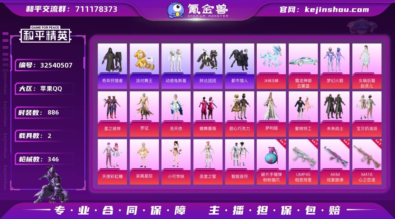 连体王者贵8 金标号 无双 珍品传说啥的都有 (背包里还有一颗荣耀水晶) 和平是ld号 特别稀有 大拇指logo已有 号里面还有4700点卷 巡查衣我以经找人刷了 不懂的可以问我 暗夜之虎已经出了 3款猫包全有 头盔 也都有了 星际m4也有 可以去看皮肤商品截图最后面的图片 吃鸡是精氪战神号 面板比较好看