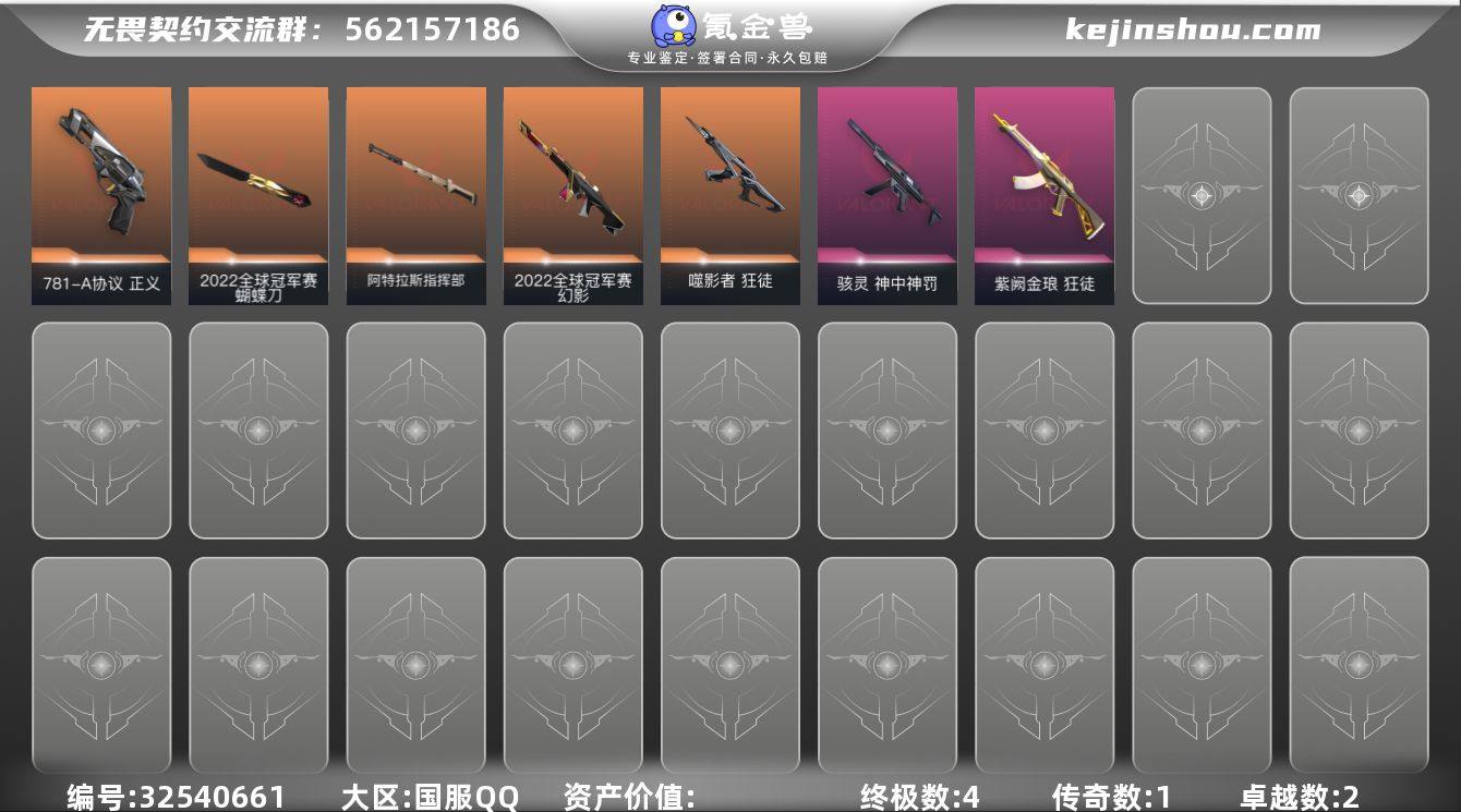 【套装】:2022全球冠军赛套装【英雄】:炼狱,维斯,暮蝶,钛狐,壹决,捷风,雷兹,幽影,不死鸟,贤者,猎枭,零,芮娜,尚勃勒,夜露,黑梦【近战武器】:近战武器-2022全球冠军赛 蝴蝶刀,近战武器-阿特拉斯指挥部 甩棍【狂徒】:狂徒-噬影者,狂徒-紫阙金琅【幻影】:幻影-2022全球冠军赛【骇灵】:骇灵-神中神罚【正义】:正义-781-A协议【卡面】:热舞环节 卡面,Clutch 卡面,无畏契约GO!第一卷:零 卡面,《双城之战》金克丝 卡面,钢锁vs盖可 卡面,代号红色 卡面,新兵报到 卡面,V契约 卡面,无畏契约 卡面【喷漆】:霓光四射 喷漆,买装还是存钱 喷漆,胜利属于无畏契约 喷漆,GLHF 喷漆,无畏契约 喷漆【挂饰】:无畏契约GO!第一卷 零 挂饰,海豹的认可 挂饰,无畏契约 纪念币 挂饰