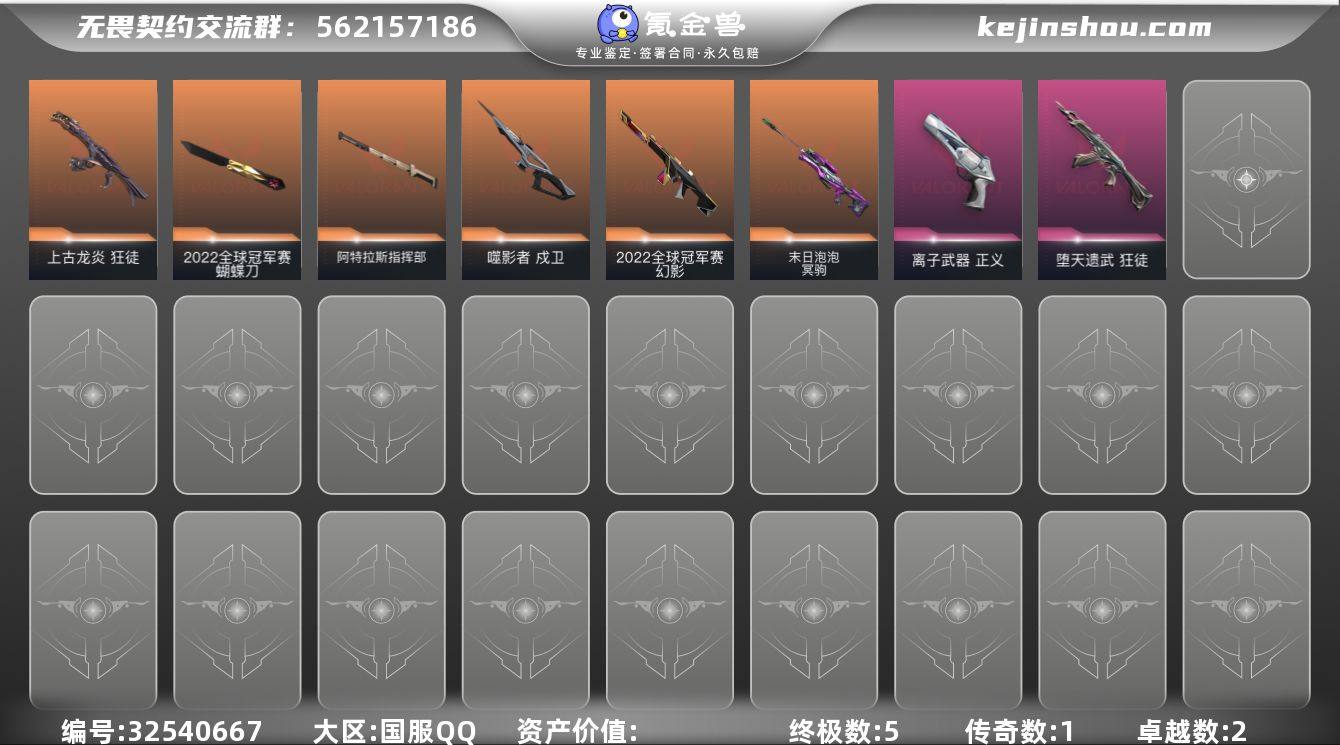 【套装】:2022全球冠军赛套装【英雄】:炼狱,暮蝶,壹决,铁臂,捷风,不死鸟,贤者,猎枭,零,芮娜,尚勃勒,霓虹【近战武器】:近战武器-2022全球冠军赛 蝴蝶刀,近战武器-阿特拉斯指挥部 甩棍【狂徒】:狂徒-上古龙炎,狂徒-堕天遗武【幻影】:幻影-2022全球冠军赛【戍卫】:戍卫-噬影者【冥驹】:冥驹-末日泡泡【正义】:正义-离子武器【卡面】:正义的化身 卡面,代号红色 卡面,新兵报到 卡面,V契约 卡面,无畏契约 卡面【喷漆】:胜利属于无畏契约 喷漆,GLHF 喷漆,无畏契约 喷漆【挂饰】:无畏契约 纪念币 挂饰