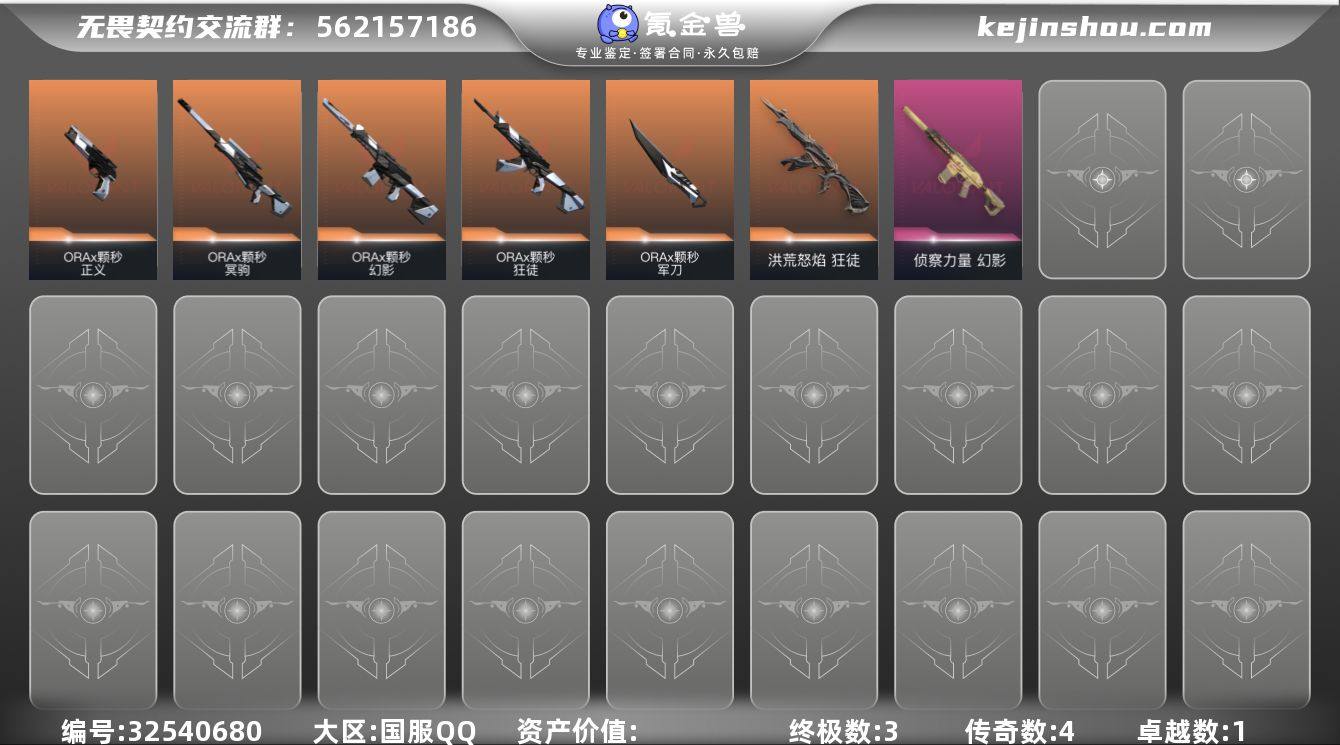 【套装】:ORA x 颗秒套装【英雄】:幻棱,炼狱,维斯,暮蝶,壹决,铁臂,捷风,雷兹,幽影,不死鸟,贤者,猎枭,零,芮娜,奇乐,尚勃勒,霓虹,夜露,黑梦,钢锁【近战武器】:近战武器-碎心裂刃,近战武器-ORA x 颗秒 军刀【狂徒】:狂徒-洪荒怒焰,狂徒-ORA x 颗秒【幻影】:幻影-ORA x 颗秒,幻影-侦察力量【冥驹】:冥驹-ORA x 颗秒【正义】:正义-ORA x 颗秒【卡面】:无畏契约GO!第一卷:芮娜 卡面,无畏契约GO!第一卷:零 卡面,代号红色 卡面,新兵报到 卡面,V契约 卡面,无畏契约 卡面【喷漆】:买装还是存钱 喷漆,胜利属于无畏契约 喷漆,GLHF 喷漆,无畏契约 喷漆【挂饰】:天外飞客 挂饰,红鳞松叶 挂饰,无畏契约 纪念币 挂饰
