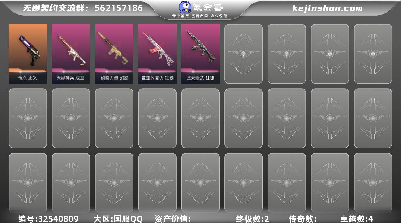 【英雄】:幻棱,炼狱,维斯,暮蝶,钛狐,壹决,铁臂,捷风,幽影,不死鸟,贤者,猎枭,零,芮娜,奇乐,尚勃勒,霓虹,斯凯,夜露,K/O,盖可,黑梦,钢锁【近战武器】:近战武器-黑波之刃【狂徒】:狂徒-堕天遗武,狂徒-盖亚的复仇【幻影】:幻影-侦察力量【戍卫】:戍卫-天界神兵【正义】:正义-奇点【卡面】:修车达人 卡面,树懒大作战 卡面,无畏契约GO!第一卷:芮娜 卡面,无畏契约GO!第一卷:零 卡面,代号红色 卡面,新兵报到 卡面,V契约 卡面,无畏契约 卡面【喷漆】:买装还是存钱 喷漆,胜利属于无畏契约 喷漆,GLHF 喷漆,无畏契约 喷漆【挂饰】:天外飞客 挂饰,无畏契约 纪念币 挂饰