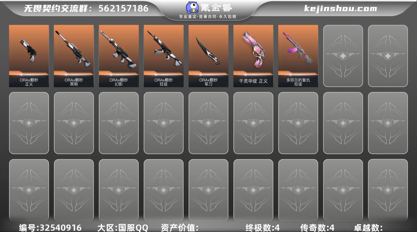【套装】:ORA x 颗秒套装【英雄】:炼狱,捷风,幽影,不死鸟,贤者,猎枭,斯凯,夜露,黑梦【近战武器】:近战武器-碎心裂刃,近战武器-ORA x 颗秒 军刀【狂徒】:狂徒-多弥尔的复仇,狂徒-ORA x 颗秒【幻影】:幻影-ORA x 颗秒【冥驹】:冥驹-ORA x 颗秒【正义】:正义-千灵华绽,正义-ORA x 颗秒【卡面】:树懒大作战 卡面,无垠星环 卡面,《双城之战》金克丝 卡面,代号红色 卡面,新兵报到 卡面,V契约 卡面,无畏契约 卡面【喷漆】:放下武器 喷漆,胜利属于无畏契约 喷漆,GLHF 喷漆,无畏契约 喷漆【挂饰】:动力机箱 挂饰,无畏契约 纪念币 挂饰