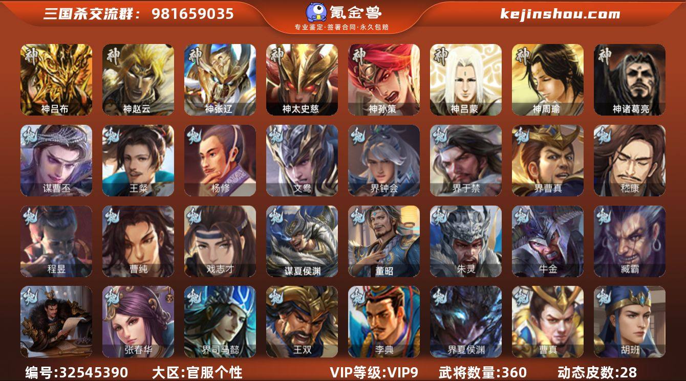 VIP等级: VIP9 官阶: 大将军 武将数量: 360 动态皮肤数量: 28 神将: 神吕布,神孙策,神太史慈,神张辽,神赵云,神吕蒙,神周瑜,神诸葛亮 魏国武将: 戏志才,曹纯,程昱,嵇康,界曹真,界于禁,界钟会,文鸯,杨修,王粲,张辽,SP蔡文姬,SP曹仁,SP关羽,SP贾诩,SP姜维,SP庞德,卞夫人,曹昂,曹操,曹冲,曹洪,曹丕,曹仁,曹叡,王异,鲁芝,界满宠,曹休,界曹植,满宠,荀攸,钟繇,蒯越蒯良,郭嘉,荀彧,杜畿,界郭嘉,崔琰,界曹丕,界荀彧,朱灵,界甄姬,吕虔,界王异,界许褚,华歆,陈群,界曹休,袁涣,李通,乐进,郭淮,毛玠,郭皇后,毌丘俭,夏侯惇,曹植,司马朗,谋于禁,界曹操,许褚,界张辽,谋徐晃,张郃,钟会,文聘,曹彰,界夏侯惇,诸葛诞,司马懿,甄姬,徐晃,孙资刘放,韩浩史涣,胡班,曹真,谋曹丕,典韦,界夏侯渊,谋荀彧,夏侯渊,李典,于禁,王双,邓艾,界司马懿,张春华,孟达-魏,臧霸,牛金,朱灵(国战),董昭,谋夏侯渊 蜀国武将: 董允,关索,谯周,沙摩柯,赵襄,周群,谋马超,谋赵云,徐庶,界魏延,杨仪,吕凯,界关羽,界诸葛亮,邓芝,界伊籍,胡金定,费祎,严颜,界黄月英,界张嶷,赵云,张松,彭羕,界刘备,刘封,糜竺,蒋琬,黄月英,刘巴,关羽,王甫赵累,吴懿,向宠,祝融,张飞,黄皓,陈震,魏延,界法正,糜夫人,刘禅,界赵云,张翼,关银屏,SP孙尚香,SP徐...