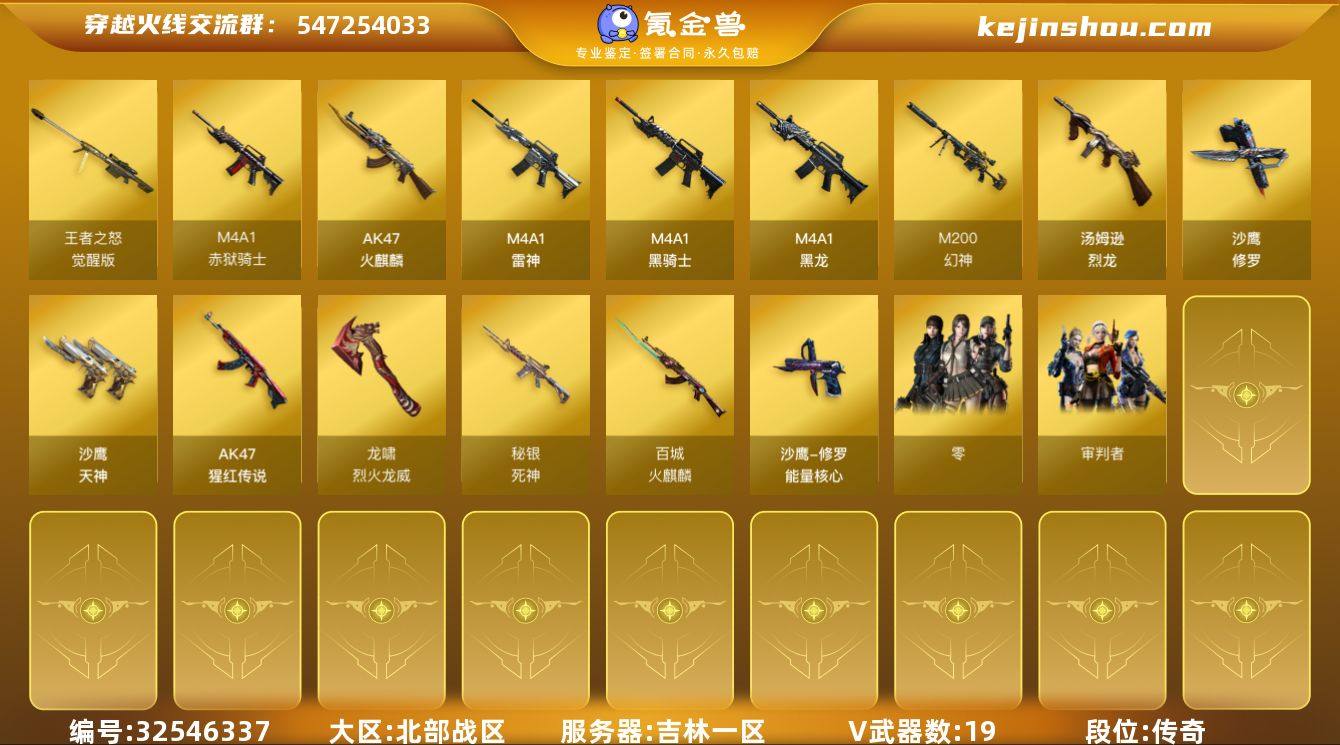 【ky6409】吉林一区-23V-1王者武器数-0炫金武器数 【热门武器】:M200-幻神,M4A1-黑骑士,汤姆逊-烈龙,沙鹰-修罗 【皮肤】:火麒麟-百城,死神-秘银,修罗-能量核心 【角色】:零,审判者,电竞少女,风暴女,娟娟,灵狐者-黄金海岸,麻雀,潘多拉-X,潘多拉-甜心教官,潜龙队-X,铁骑荣耀,兔囡囡 【人偶武器】:迷你生化手雷 【暴走生化】:超级对讲机 【挑战大师】:激光毁灭者III 【英雄级武器】:AK47-火麒麟,M4A1-黑龙,M4A1-雷神*2,M4A1-黑骑士,AK-47-猩红传说,M200-幻神,王者之怒-觉醒版,汤姆逊-烈龙,沙鹰-修罗,沙鹰-天神,龙啸-烈火龙威,高爆手雷-竞技荣光*3,闪光弹-竞技荣光*2,烟雾弹-幻灵,烟雾弹-竞技荣光*2,M4A1-赤狱骑士 【源级武器】:魂·火麒麟-百城,源·雷神,魂·雷神-新春神龙,魂·雷神-萌柴,御·雷神-烈虎,魂·黑骑士-破浪10年*2,御·黑骑士-冰魄,源·机械迷城,M4A1-青龙-掌上穿越火线,源-金色蔷薇,金色蔷薇-狼王,源·天龙,魂·裁决-凤灵*2,魂·毁灭-青帝*2,魂·Barrett-朱雀-锦鲤,源·Barrett-朱雀,魂·屠龙-惊鸿,魂·擎天-破浪10年,源·龙啸*2,魂·麒麟刺-神秘黑洞 【道具】:CFS限定背包,哔哩哔哩名片,绿色巨人,灵魂忍者,迷雾幽灵...