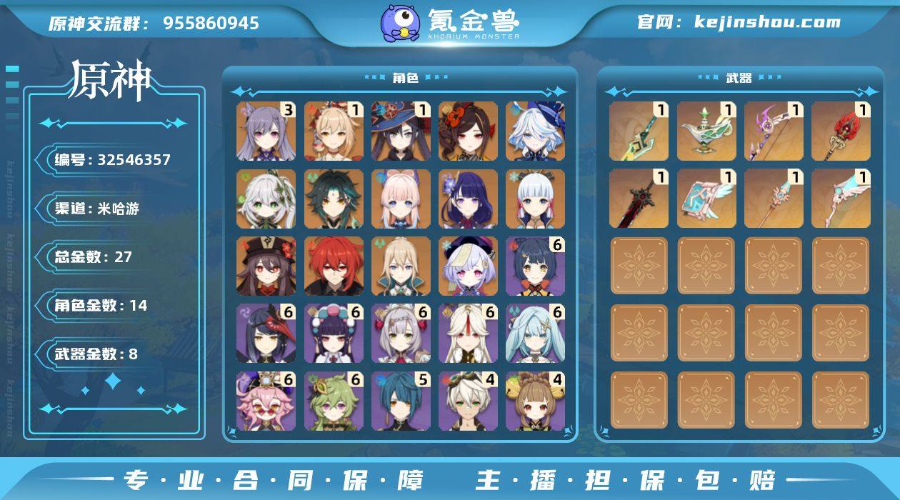 17黄 行秋5命 满命香菱!5金武护摩飞雷! 这是一个非常难得的中高练度账号! 角色池:17金五星,人权卡全覆盖(芙宁娜/雷神/草神),胡桃、魈、神里、宵宫全都有。 命座优势:香菱满命 + 行秋5命,这两个核心辅助练度拉满,深渊割草如切菜。 武器池:护摩之杖、飞雷之弦振、千夜浮梦等,专武配套齐全。 性价比:省去抽卡几万原石的成本,也省去了肝满命座的时间。 探索度没怎么肝,适合想自己慢慢探索的玩家。 售价:¥280,诚心出售,非诚勿扰。