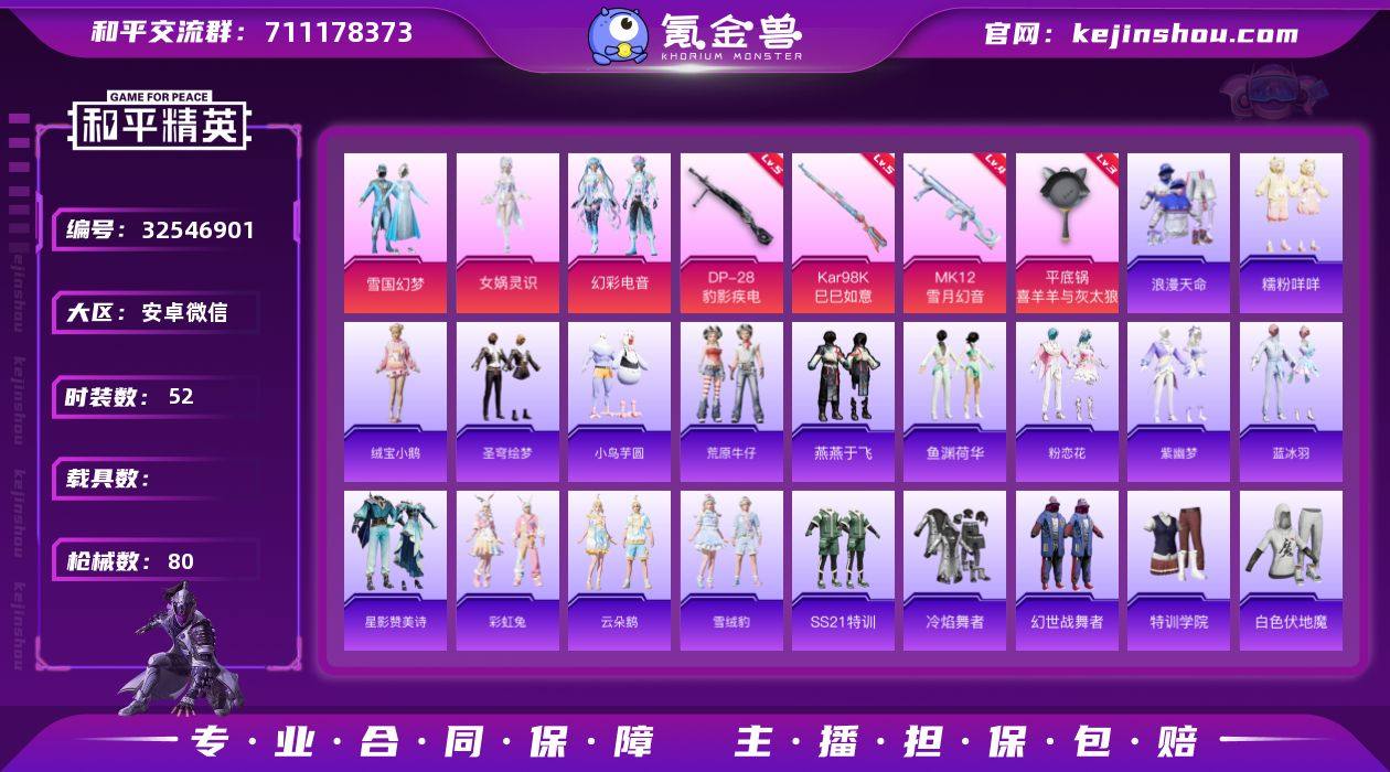 【AZH1843】安卓 微信【雪国幻梦糯粉咩咩女娲灵识 三级喜羊羊与灰太狼平底锅】3粉装-4特效枪-0载具-1粉色飞行器-21291热力值-4王牌印记-52套装-80枪皮 【热门品类】:粉装-雪国幻梦,套装-浪漫天命,套装-糯粉咩咩 【粉色套装】:粉装-雪国幻梦,角色-女娲灵识,粉装-幻彩电音 【粉色枪皮等级】:Kar98K-巳巳如意(五级),MK12-雪月幻音(四级),DP-28-豹影疾电(五级),平底锅-喜羊羊与灰太狼(三级) 【粉色枪皮】:Kar98K-巳巳如意,MK12-雪月幻音,DP-28-豹影疾电,平底锅-喜羊羊与灰太狼 【粉色降落伞】:樱桃泡泡降落伞,星穹咏叹调降落伞,冷漠罗丽降落伞 【稀有套装】:套装-绒宝小鹅,套装-圣穹绘梦,套装-小鸟芋圆,套装-荒原牛仔,套装-燕燕于飞,套装-鱼渊荷华,套装-粉恋花,套装-紫幽梦,套装-蓝冰羽,套装-星影赞美诗,套装-彩虹兔,套装-云朵鹅,套装-雪绒豹 【稀有枪皮】:AKM-破晓战魂,M16A4-蓝色火焰,SCAR-L-炫彩节奏,SCAR-L-玉兔迎春,M416-蓝色火焰,GROZA-晶梦幻蝶,M762-彩虹符号,M762-云朵鹅,G36C-星穹咏叹调,AC-VAL-天降萌叽,UZI-啾咪啾咪,UMP45-生命誓言,UMP45-绒宝小鹅,UMP45-极意拳锋,汤姆逊-耀粉歌者,Kar98K-星穹咏叹调,SLR-圣穹绘梦,M...