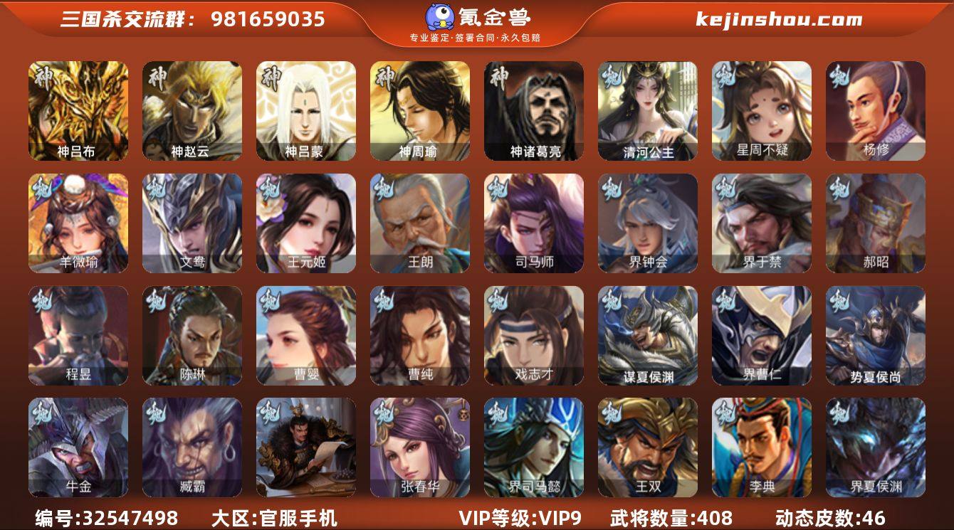【14789686】官阶:大将军;VIP等级:VIP9;史诗武将数量:52;动态皮肤数量:46;武将总数:408;史诗宝珠数量:0;将魂数量:6796;神将:3;魏国史诗武将:40;蜀国史诗武将:8;吴国史诗武将:8;群史诗武将:20