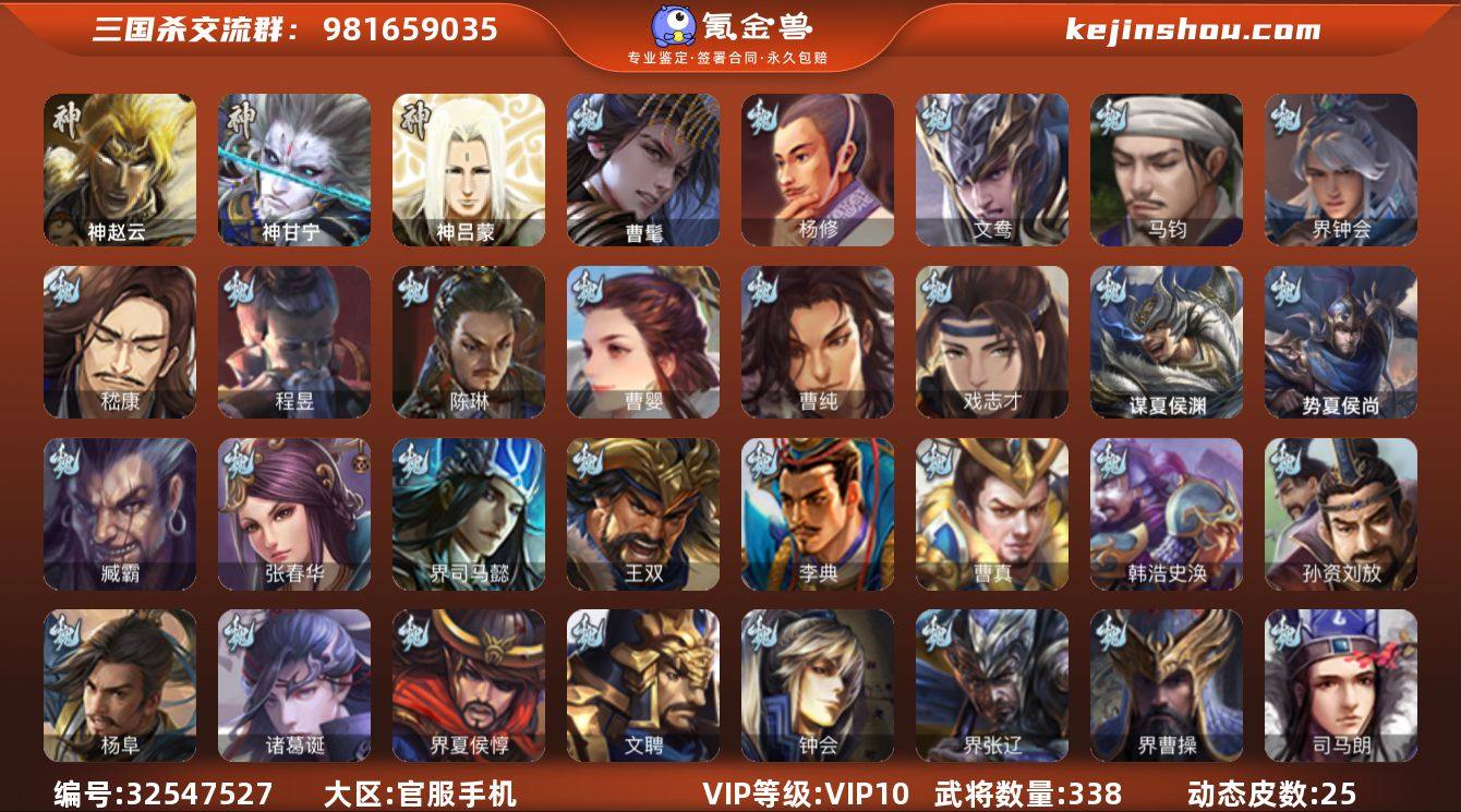 【14789685】官阶:大将军;VIP等级:VIP10;史诗武将数量:37;动态皮肤数量:25;武将总数:338;史诗宝珠数量:5;将魂数量:3140;神将:2;魏国史诗武将:12;蜀国史诗武将:8;吴国史诗武将:7;群史诗武将:11