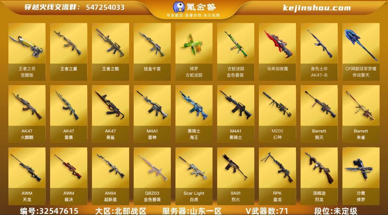 山东一区-74V-5王者武器数-1炫金武器数 【热门武器】:QBZ03-金色蔷薇,Scar Light-白虎,M200-幻神,金色蔷薇-古蛇迷踪,修罗-古蛇迷踪,M200-竞技荣光,死亡之眼,M4A1-黑骑士,汤姆逊-烈龙*5,RPK-盘龙*2,加特林-炼狱,斯泰尔-蝴蝶,火麒麟-绝迹,USP-雷暴,沙鹰-修罗*2 【王者炫金武器】:王者之戮,王者之翼,炫金千变 【音效卡】:修罗-古蛇迷踪音效卡,M4A1-黑骑士音效卡,Barrett-毁灭音效卡 【皮肤】:金色蔷薇-破浪逐光 皮肤,雷神-暗月,雷神-荣耀之魄,火麒麟-雷神,火麒麟-平天大圣,毁灭-星空,毁灭-CFS2020,毁灭-SV-CFPLS16冠军,M4A1-千变-孔明皮肤,黑龙-美杜莎 皮肤,黑骑士-地狱火,无影耀金皮肤,战神-粉色甜心皮肤,战神-紫绶金章皮肤,战神-流金岁月皮肤,AK47-B-常胜将军-曹操*2,AK47-B-常胜将军-刘备,AK47-B-常胜将军-孙权,修罗-能量核心,屠龙-破浪逐光 皮肤 【角色】:葵,电竞教官-云悠悠,王者-葵-貂蝉,蛇隐宗,初恋灵狐,灵狐者-X,潜龙队-X,蛇姬,斯沃特-X,蜀雪,影武者-X 【人偶武器】:火麒麟-绝迹,斯泰尔-蝴蝶,迷你深渊冰龙,迷你牛魔王,夺魂,迷你生化手雷*2,生化手雷-机甲核心,深渊终结者手雷,闪光弹-小乔,闪光弹-貂蝉,高...
