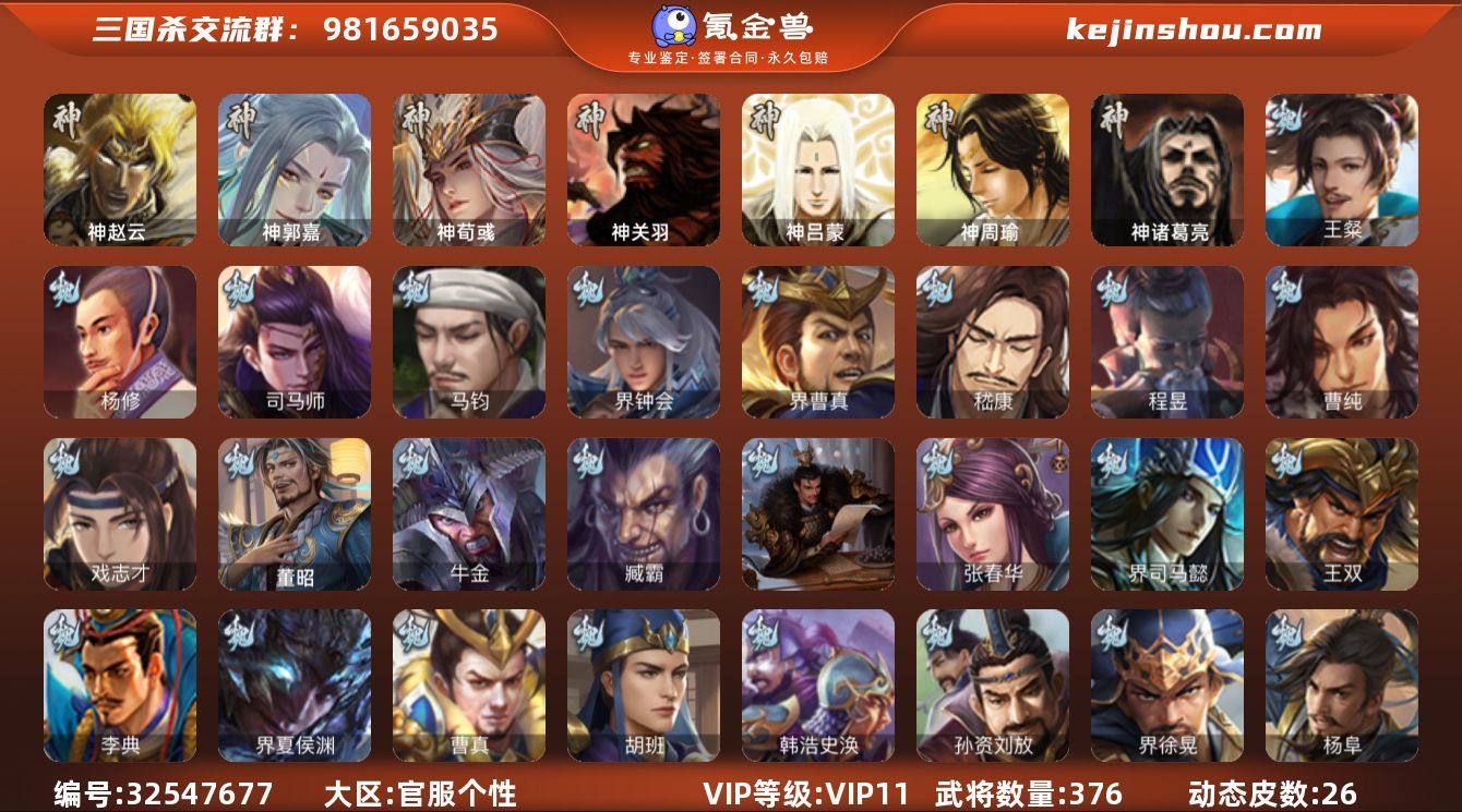 【3150】官阶:大将军;VIP等级:VIP11;史诗武将数量:40;动态皮肤数量:26;武将总数:376;史诗宝珠数量:0;将魂数量:3313;神将:4;魏国史诗武将:9;蜀国史诗武将:10;吴国史诗武将:5;群史诗武将:12