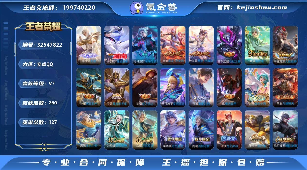 实名: 可修改 性别: 男号 贵族等级: V7 英雄数: 127 皮肤数: 260 无双皮: 无相 珍品传说: 怪盗基德 传说皮: 黄金射手座,绛天战甲,久胜战神,地狱之眼,时之恋人-刘备,末日机甲-孙策,挚爱之约,妄想实况,乘龙·问璇玑,乘龙·淬吴钩 限定皮: 李小龙,梁祝,逐梦之星,大圣娶亲,高山流水,孙行者,深海之息,五谷丰年,山海·玄木吟,鸣野蒿,逐霄战戟 亮点: 【优质装备】:怪盗基德,黄金射手座,绛天战甲(鸡嘴战神),久胜战神,地狱之眼,时之恋人-刘备(电焊工),末日机甲-孙策,挚爱之约,妄想实况