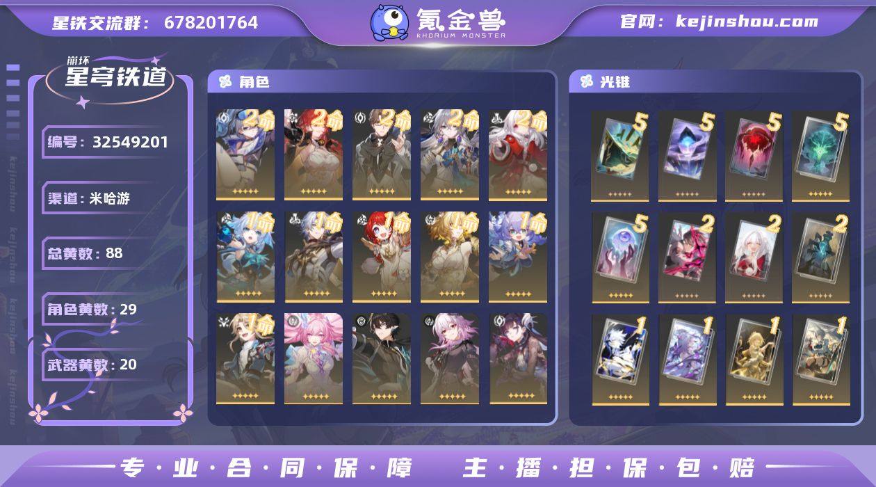 【崩坏·星穹铁道】冒险等级:70,女主,五星数量:49,五星角色:银狼 * 2命,布洛妮娅 * 2命,姬子 * 2命,瓦尔特 * 2命,克拉拉 * 2命,白露 * 1命,彦卿 * 1命,阿格莱雅 * 1命,缇宝 * 1命,白厄 * 1命,刻律德菈 * 1命,飞霄,星期日,刃,卡芙卡,遐蝶,符玄,托帕&账账,真理医生,黑天鹅,花火,风堇,砂金,知更鸟,Archer,海瑟音,长夜月,丹恒·腾荒,昔涟__五星光锥:星海巡航 * 5精,记忆的质料 * 5精,记一位星神的陨落 * 5精,不息的演算 * 5精,记忆永不落幕 * 5精,以世界之名 * 2精,无可取代的东西 * 2精,孤独的疗愈 * 2精,制胜的瞬间,银河铁道之夜,无可取代的东西,但战斗还未结束,雨一直下,我将,巡征追猎,将光阴织成黄金,到不了的彼岸,只需等待,让告别,更美一些,夜色流光溢彩,黎明恰如此燃烧__四星角色:阿兰 * 6命,娜塔莎 * 6命,虎克 * 6命,貊泽 * 6命,黑塔 * 6命,丹恒 * 6命,艾丝妲 * 6命,希露瓦 * 6命,停云 * 6命,素裳 * 6命,桑博 * 6命,三月七 * 6命,青雀 * 6命,佩拉 * 6命,驭空 * 6命,卢卡 * 6命,玲可 * 6命,桂乃芬 * 6命,寒鸦 * 6命,雪衣 * 6命,米沙 * 6命,加拉赫 * 6命 遐蝶队,白厄队,追击队,辅助全