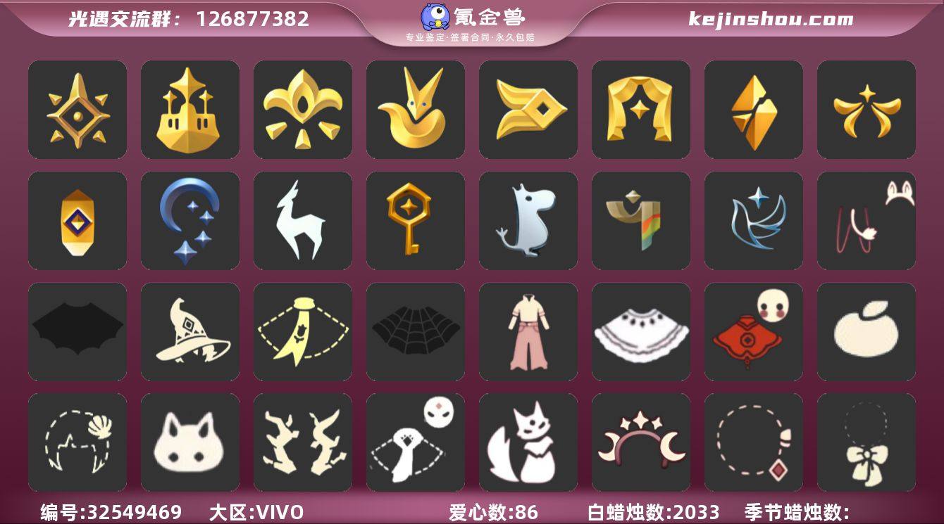 账号类型: 手机账号 季节已毕业: 预言季,梦想季,小王子季,风行季,表演季,破晓季,欧若拉季,集结季,夜行季,追忆季,九色鹿季,筑巢季,姆明季,彩染季,青鸟季 完成地图: 晨岛,云野,雨林,霞谷,暮土,禁阁 珍稀物品: 阿努比斯(狗头),白枭,透明蝶翼斗,玫瑰花 礼包: 蝙蝠套,巫师,围巾,蜘蛛斗,牛仔裤,白绒金,福娃,橘子,贝壳,兔子,枯角,猫套,猫背饰,星月头饰,彩虹耳钉,蝴蝶结,四叶草,创始人,海蓝波浪发型,姆明饰品套装 裤子: 武士裤,背带裤,搓澡巾,击剑裤,妮妮裙子,王子服,蓝绿裤,筑巢季·裤子,风行毕业裤子 面具: 阿努比斯,凤凰面具,夜行毕业面具,黄眉企鹅面具,辉光羚羊面具 面饰: 红耳机,青鸟毕业面饰 项链: 围巾 发型: 若笠,虚荣,小王子发型,留辫蘑菇头,飞天盘发 头饰: 行军锅头盔,羽毛发饰,蓝色音乐会,平顶帽 斗篷: 海洋斗,蟑螂斗,绿芽,粉红绒毛斗篷,遥鲲斗篷,黄色连帽披风,燕尾斗篷,冥龙斗篷,彩染围巾斗篷,青鸟毕业斗篷 配饰: 雨伞,筑巢季·小手办,高音钢琴,姆明抱枕,小红伞,玫瑰花,圆鼓,鲲灯 亮点: 【优质装备】:预言季,阿努比斯(狗头),表演季,白枭(帝企鹅发),武士裤,梦想季,小王子季(王子季),风行季,破晓季,透明蝶翼斗,欧若拉季(欧若拉),行军锅头盔(六边锅帽子)(双耳锅帽子),羽毛发...