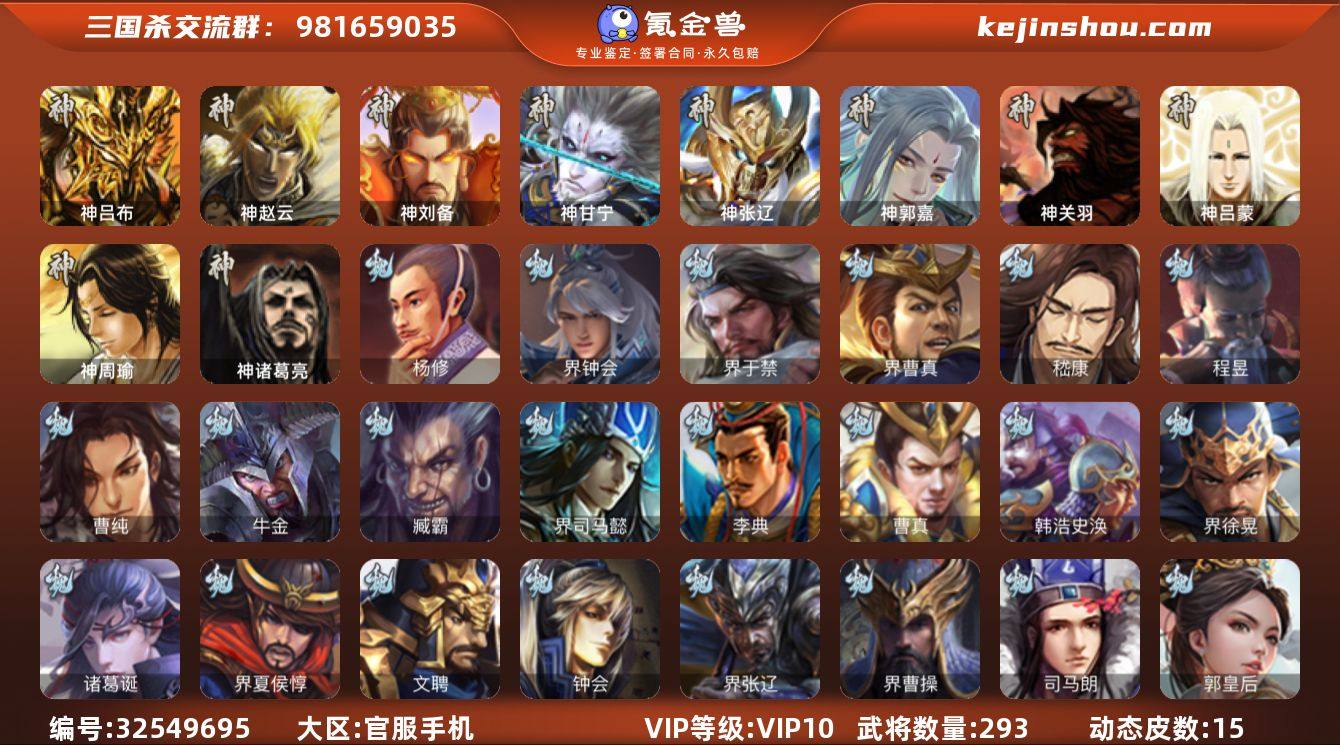 神吕布,神赵云,神刘备,神甘宁,神张辽,神郭嘉,神诸葛亮,杨修,界钟会,界于禁,界曹真,嵇康,曹纯,程昱,马云騄,谋马超,张星彩,花鬘,吴景,孙皓,骆统,留赞,界徐盛,界步练师,苏飞,麹义,南华老仙,沮授,陈登,许攸,兀突骨,神吕蒙,神周瑜,神关羽,SP关羽,SP蔡文姬,乐进,曹昂,诸葛诞,朱灵,文聘,SP姜维,钟会,曹冲,郭淮,满宠,界王异,界曹操,界司马懿,界夏侯惇,界张辽,界许褚,界郭嘉,李典,曹真,韩浩史涣,陈群,曹叡,曹休,钟繇,司马朗,王基,郭皇后,辛宪英,吕虔,鲁芝,界荀彧,界徐晃,界曹丕,张恭,贾逵,界曹植,界郭淮,卞夫人,华歆,蔡贞姬,崔琰,谋于禁,牛金,臧霸,SP孙尚香,夏侯霸,马良,关兴张苞,廖化,界马岱,关平,简雍,刘封,界法正,界关兴张苞,界刘备,界关羽,界赵云,界马超,SP徐庶,吴懿,周仓,张松,刘谌,夏侯氏,糜竺,李严,黄皓,界黄月英,界诸葛亮,赵统赵广,严颜,界伊籍,界庞统,界廖化,傅肜,费祎,界周仓,谋庞统,界张嶷,谋姜维,诸葛果,蒋琬费祎,甘夫人,孙茹,凌操,诸葛恪,诸葛瑾,孙鲁育,程普,韩当,潘璋马...