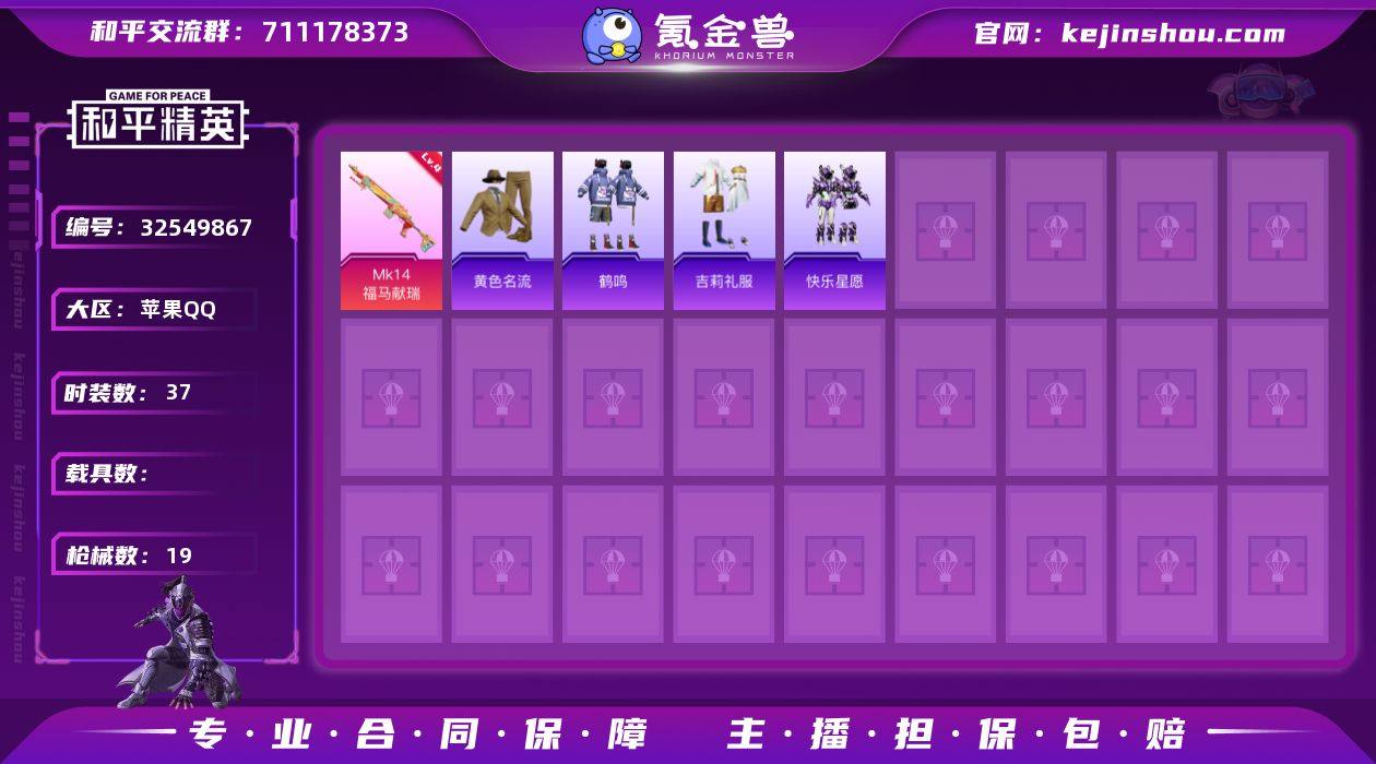 实名: 可修改 时装数: 37 枪械数: 19 稀有枪皮: MK14-福马献瑞