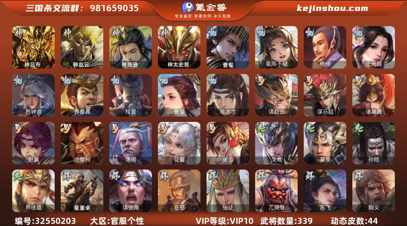 VIP等级: VIP10 官阶: 大将军 武将数量: 339 动态皮肤数量: 44 神将: 神陆逊,神吕布,神太史慈,神赵云 魏国武将: 戏志才,曹婴,程昱,界曹真,界钟会,王元姬,杨修,星周不疑,曹髦 蜀国武将: 关索,花鬘,谯周,沙摩柯,赵襄,诸葛瞻,谋马超,谋赵云 吴国武将: 界徐盛,孙皓,吴景,文鸯 群国武将: 杜预,公孙康,界李儒,界左慈,沮授,刘焉,南华老仙,麹义,苏飞,兀突骨,张让,左慈,谋张角,星董卓