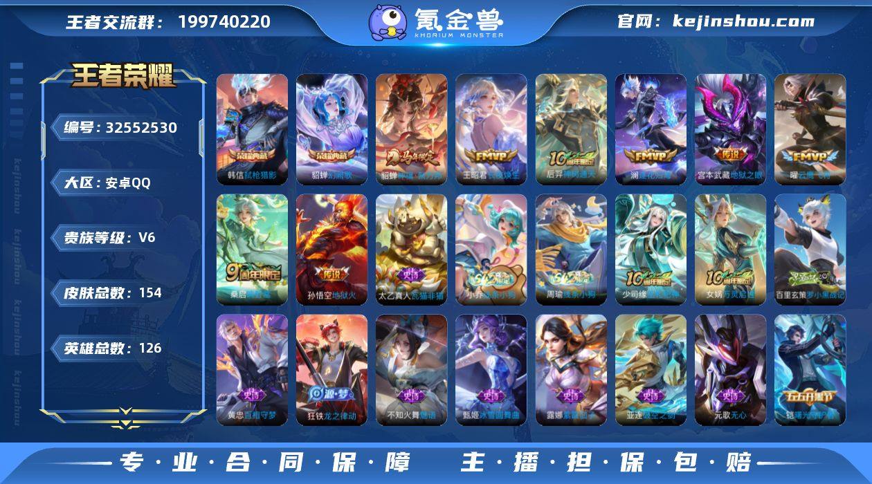 安卓Q-V6-最强王者段位-126英雄-154皮肤-2典藏皮肤-8传说-44史诗 【英雄全皮】:孙权全皮 【荣耀典藏】:貂蝉幻阙歌,韩信弑枪猎影 【传说皮肤】:貂蝉神骥聚万邦,王昭君长夜焕生,后羿神树通天,桑启鸣野蒿,澜逐花归海,曜云鹰飞将,宫本武藏地狱之眼,孙悟空地狱火 【限定皮肤】:狄仁杰阴阳师,赵云皇家上将,孙尚香蔷薇恋人,元歌无心,狄仁杰魔术师,达摩沙漠行僧,项羽海滩派对,李元芳云中旅人,裴擒虎擒涛扼浪,云中君纤云弄巧,鲁班大师探海日志,桑启海盐诗旅,张良古海寻踪,鬼谷子天穹祈灯,沈梦溪龙舞盛年,刘邦剑破天穹,周瑜熔金海岸 【赛季限定】:达摩沙漠行僧,李元芳云中旅人,桑启海盐诗旅,裴擒虎擒涛扼浪,鲁班大师探海日志,张良古海寻踪,鬼谷子天穹祈灯,刘邦剑破天穹,东皇太一噬灭天穹,太乙真人谧流熔炉,钟馗虚灵犬护,甄姬逆浪荇歌,亚瑟荣光之誓 【战令限定】:亚连破空之剑,孙悟空神迹守卫,百里守约百相守梦,老夫子百相守梦,周瑜线条小狗,小乔线条小狗 【史诗皮肤】:太乙真人瓦猫非猫,周瑜线条小狗,小乔线条小狗,少司缘巫礼祀神,女娲万灵启世,百里玄策罗小黑战记,黄忠百相守梦,狂铁龙之律动,百里守约百相守梦,艾琳陌上桑,...