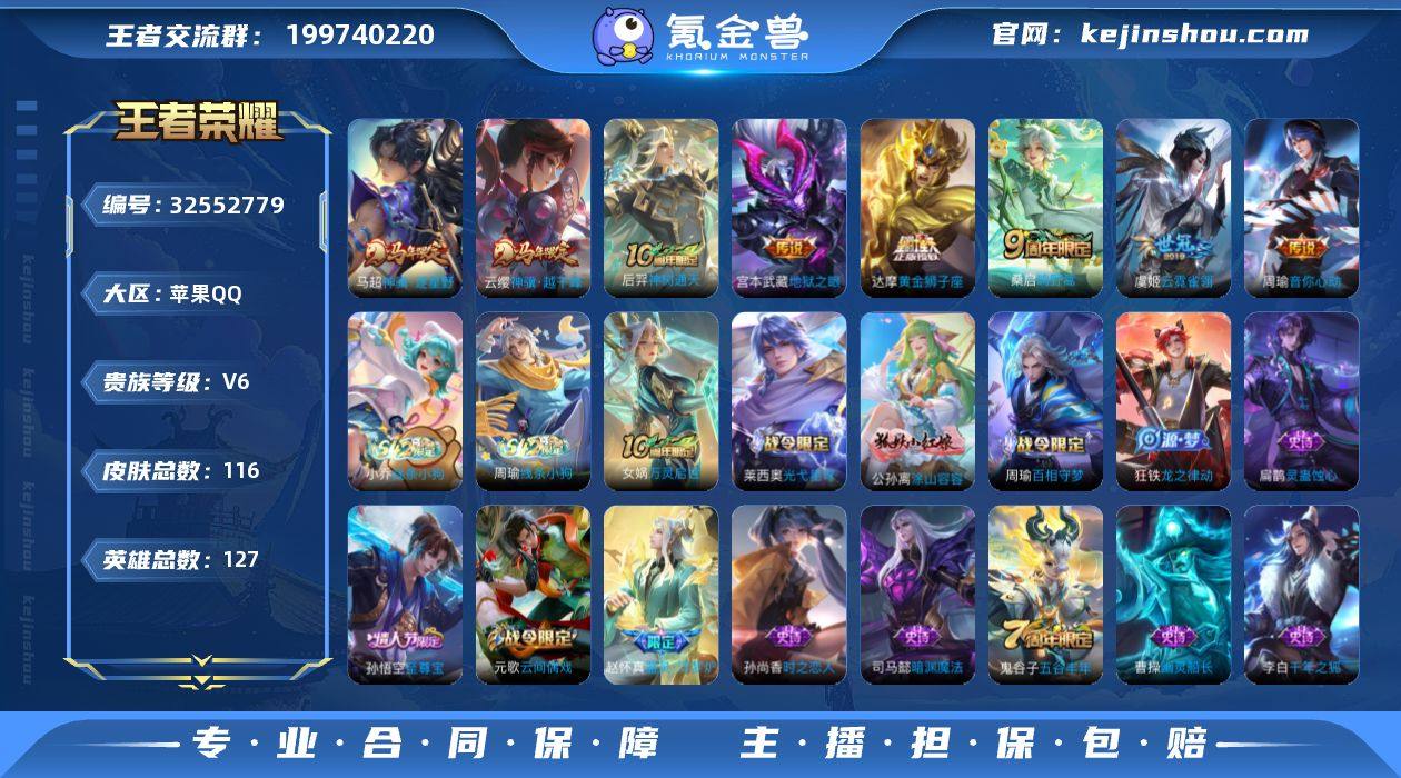 无二次-苹果Q-V6-最强王者段位-127英雄-116皮肤-8传说-34史诗 【英雄全皮】:敖隐全皮 【传说皮肤】:云缨神骥越千峰,马超神骥逐星野,后羿神树通天,桑启鸣野蒿,周瑜音你心动,虞姬云霓雀翎,达摩黄金狮子座,宫本武藏地狱之眼 【限定皮肤】:狄仁杰阴阳师,赵云皇家上将,元歌云间偶戏,狄仁杰魔术师,项羽海滩派对,兰陵王金庭之子,孙悟空至尊宝,李元芳云中旅人,鬼谷子五谷丰年,沈梦溪大漠名商,裴擒虎擒涛扼浪,上官婉儿梁祝,鲁班大师探海日志,桑启海盐诗旅,艾琳女武神,阿古朵江河有灵,张良古海寻踪,鬼谷子天穹祈灯 【赛季限定】:兰陵王金庭之子,沈梦溪大漠名商,李元芳云中旅人,桑启海盐诗旅,裴擒虎擒涛扼浪,鲁班大师探海日志,张良古海寻踪,鬼谷子天穹祈灯,东皇太一噬灭天穹,甄姬逆浪荇歌,亚瑟荣光之誓 【战令限定】:元歌云间偶戏,周瑜百相守梦,孙策百相守梦,莱西奥光弋星穹,明世隐往忆晖光,周瑜线条小狗,小乔线条小狗 【史诗皮肤】:周瑜线条小狗,小乔线条小狗,女娲万灵启世,莱西奥光弋星穹,公孙离涂山容容,周瑜百相守梦,扁鹊灵蛊蚀心,狂铁龙之律动,赵怀真器灵浮梦炉,阿古朵江河有灵,鬼谷子五谷丰年,司马懿暗渊魔法,杨戬天秀...