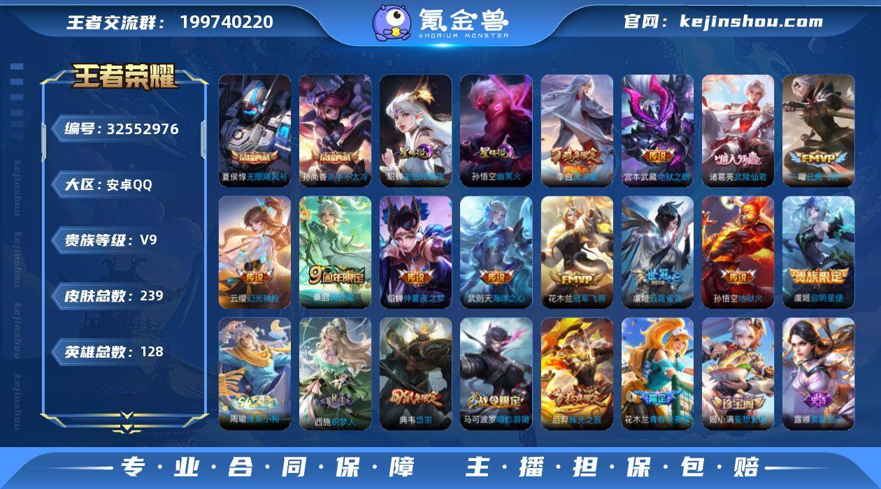 安卓Q-V9-永恒钻石II段位-128英雄-239皮肤-2典藏皮肤-1典藏英雄-12传说-48史诗【英雄全皮】:空空儿全皮【荣耀典藏】:武则天英雄,夏侯惇无限飓风号,孙尚香杀手不太冷【传说皮肤】:云缨幻光神枪,桑启鸣野蒿,虞姬启明星使,曜云鹰飞将,虞姬云霓雀翎,花木兰冠军飞将,诸葛亮武陵仙君,貂蝉仲夏夜之梦,李白凤求凰,宫本武藏地狱之眼,孙悟空地狱火,武则天海洋之心【限定皮肤】:姜子牙天穹之誓,狄仁杰阴阳师,虞姬凯尔特女王,赵云皇家上将,嬴政优雅恋人,庄周蜃楼王,阿轲迷踪丽影,钟无艳王者之锤,孙膑妖精王,扁鹊炼金王,芈月重明,吕布猎兽之王,周瑜赤莲之焰,夏侯惇朔风刀,典韦岱宗,马可波罗暗影游猎,狄仁杰魔术师,狄仁杰万华元夜,达摩沙漠行僧,项羽海滩派对,老夫子醍醐杖,程咬金演武夺筹,刘邦夺宝奇兵,兰陵王驯魔猎人,花木兰青春决赛季,亚瑟狮心王,后羿辉光之辰,李元芳银河之约,李元芳云中旅人,虞姬启明星使,钟馗神迹守卫,钟馗驱傩正仪,蔡文姬繁星吟游,东皇太一逐梦之光,鬼谷子原初探秘者,诸葛亮武陵仙君,苏烈千军破阵,百里玄策原初追逐者,弈星混沌棋,沈梦溪星空之诺,沈梦溪大漠名商,明世隐疑决卦,裴擒虎李小龙,狂铁御狮,米...