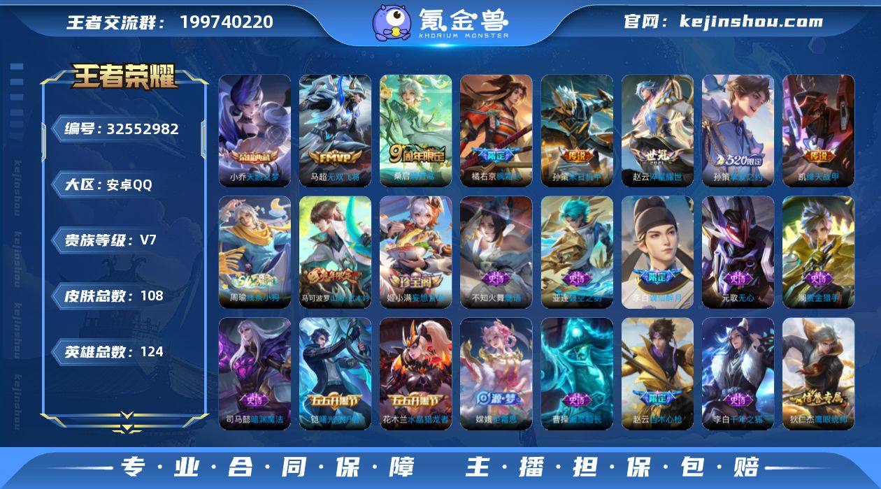 安卓Q-V7-最强王者段位-124英雄-108皮肤-1典藏皮肤-7传说-35史诗【荣耀典藏】:小乔天鹅之梦【传说皮肤】:桑启鸣野蒿,橘右京枫霜尽,马超无双飞将,孙策挚爱之约,孙策末日机甲,赵云淬星耀世,铠绛天战甲【限定皮肤】:姜子牙天穹之誓,李白谪仙醉月,狄仁杰阴阳师,赵云皇家上将,赵云百木心枪,元歌无心,马可波罗山海玄木吟,狄仁杰魔术师,达摩沙漠行僧,项羽海滩派对,兰陵王金庭之子,橘右京枫霜尽,李元芳云中旅人,雅典娜黎明之约,梦奇顽趣,沈梦溪大漠名商,裴擒虎擒涛扼浪,孙策挚爱之约,嫦娥拒霜思,鲁班大师探海日志,桑启海盐诗旅,张良古海寻踪,鬼谷子天穹祈灯,姬小满妄想食味,沈梦溪龙舞盛年,刘邦剑破天穹,程咬金群星魔术团,刘备异域游侠【年限皮肤】:马可波罗山海玄木吟【赛季限定】:达摩沙漠行僧,兰陵王金庭之子,沈梦溪大漠名商,李元芳云中旅人,桑启海盐诗旅,裴擒虎擒涛扼浪,鲁班大师探海日志,张良古海寻踪,鬼谷子天穹祈灯,刘邦剑破天穹,姜子牙天穹之誓,东皇太一噬灭天穹,亚瑟荣光之誓,雅典娜黎明之约,梦奇顽趣,牛魔星界战将【战令限定】:亚连破空之剑,孙悟空神迹守卫,周瑜线条小狗【史诗皮肤】:周瑜线条小狗,牛魔星界战将...