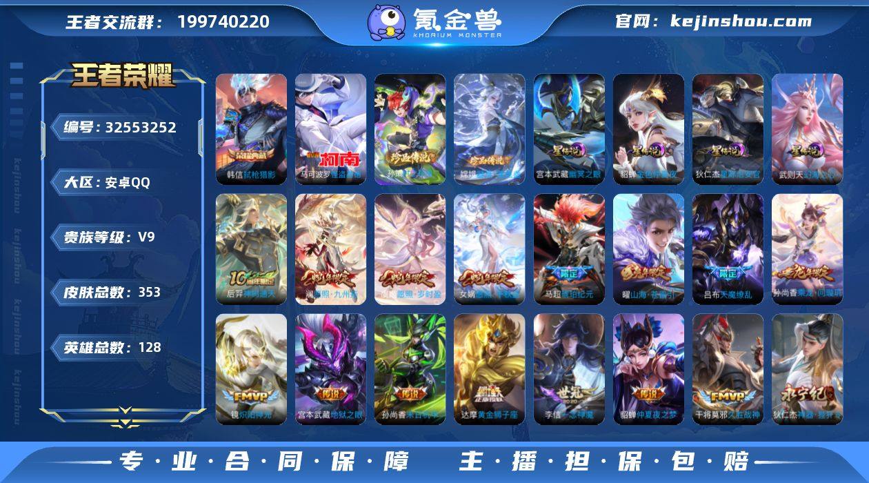 安卓Q-V9-最强王者段位-128英雄-353皮肤-1典藏皮肤-3珍品传说-24传说-95史诗【英雄全皮】:刘邦全皮,孙权全皮,敖隐全皮【荣耀典藏】:韩信弑枪猎影【珍品传说】:嫦娥器灵落星盏,孙策时之奇旅,马可波罗怪盗基德【传说皮肤】:貂蝉神骥聚万邦,后羿神树通天,女娲愿照千秋盛,澜愿照九州拓,虞姬愿照岁时盈,孙尚香乘龙问璇玑,马超琥珀纪元,澜电玩雷克斯,曜山海苍雷引,狄仁杰神器狴犴令,镜炽阳神光,虞姬启明星使,李信一念神魔,张良黄金白羊座,干将莫邪久胜战神,虞姬云霓雀翎,达摩黄金狮子座,后羿黄金射手座,貂蝉仲夏夜之梦,孙尚香末日机甲,宫本武藏地狱之眼,孙悟空地狱火,吕布天魔缭乱,狄仁杰超时空战士星际治安官 幻海之心 幽冥之眼 金色仲夏夜 【限定皮肤】:大乔绒语心约,姜子牙天穹之誓,杨戬破阵退雄兵,狄仁杰阴阳师,赵云皇家上将,墨子降魔,嬴政白昼王子,鲁班七号狮舞东方,高渐离玩趣恶龙,阿轲迷踪丽影,扁鹊奇幻香踪,芈月重明,吕布天魔缭乱,吕布猎兽之王,元歌无心,夏侯惇朔风刀,曹操烛龙,典韦穷奇,马可波罗暗影游猎,马可波罗山海玄木吟,狄仁杰魔术师,狄仁杰万华元夜,狄仁杰神器狴犴令,达摩沙漠行僧,项羽海滩派对,项羽霸王...