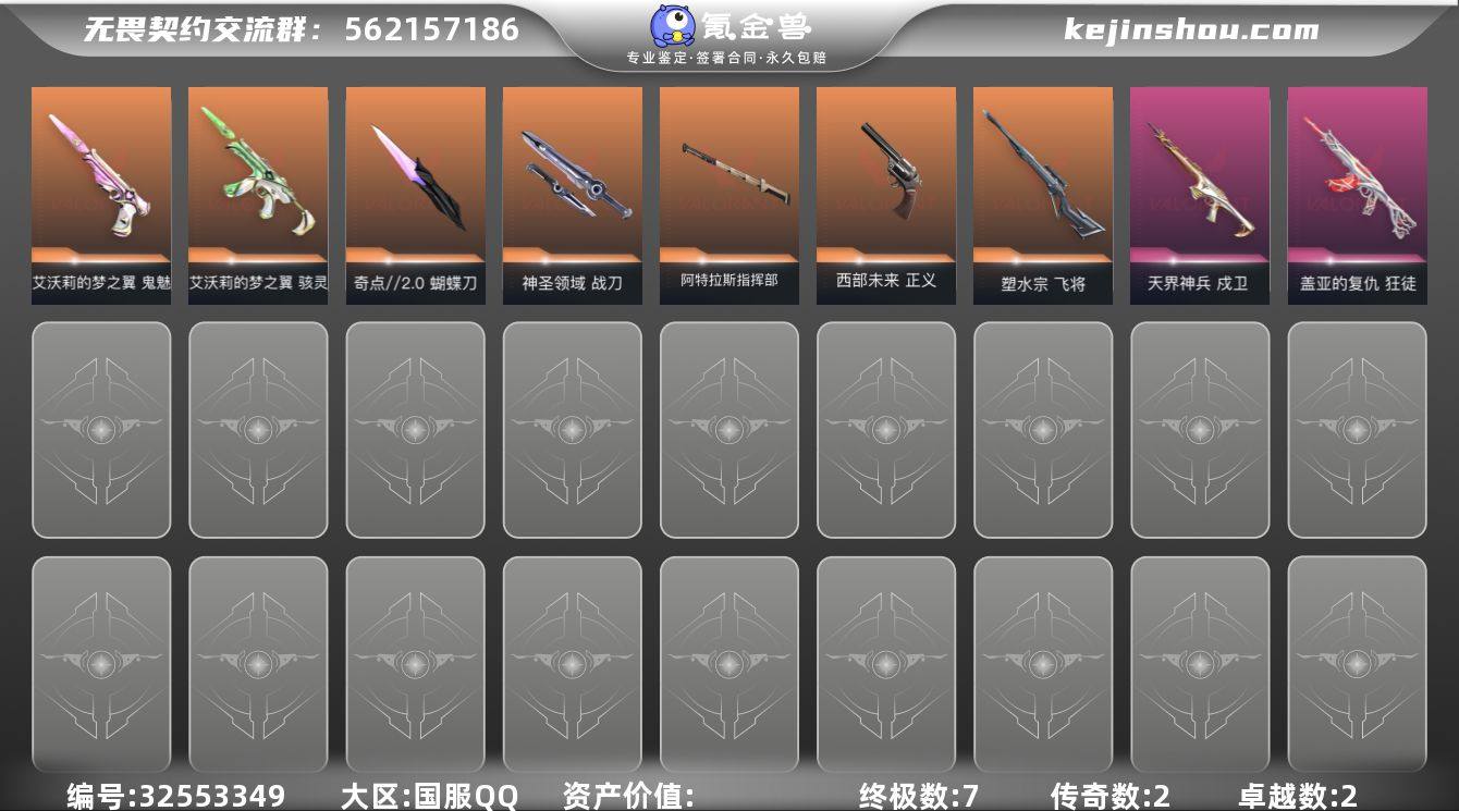 【英雄】:幻棱,炼狱,维斯,暮蝶,钛狐,壹决,铁臂,捷风,雷兹,幽影,不死鸟,贤者,猎枭,蝰蛇,零,芮娜,奇乐,尚勃勒,霓虹,斯凯,夜露,星礈,K/O,海神,盖可,黑梦,钢锁【近战武器】:近战武器-影钩,近战武器-奇点//2.0 蝴蝶刀,近战武器-神圣领域 战刀,近战武器-阿特拉斯指挥部 甩棍【狂徒】:狂徒-盖亚的复仇【幻影】:幻影-神圣领域【戍卫】:戍卫-天界神兵,戍卫-月球哨兵【獠犬】:獠犬-神圣领域【冥驹】:冥驹-星云暗涌【飞将】:飞将-塑水宗【莽侠】:莽侠-月球哨兵【战神】:战神-神圣领域【雄鹿】:雄鹿-月球哨兵【骇灵】:骇灵-艾沃莉的梦之翼,骇灵-星云暗涌【蜂刺】:蜂刺-星云暗涌【正义】:正义-西部未来,正义-月球哨兵【鬼魅】:鬼魅-艾沃莉的梦之翼,鬼魅-星云暗涌【狂怒】:狂怒-神圣领域【卡面】:精灵大战 卡面,南瓜盛典 卡面,无畏契约:暮蝶 卡面,Clutch 卡面,无畏契约:尚勃勒 卡面,无畏契约GO!第一卷:芮娜 卡面,无畏契约GO!第一卷:零 卡面,代号红色 卡面,新兵报到 卡面,V契约 卡面,无畏契约 卡面【喷漆】:控场勿近 喷漆,伤心心 喷漆,审判之爪 喷漆,致命优雅 喷漆,买装还是存钱 喷漆,放下武器 喷漆,胜利属于无畏...