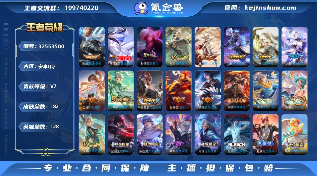 安卓Q-V7-最强王者段位-128英雄-182皮肤-1典藏皮肤-1珍品传说-11传说-58史诗【英雄全皮】:孙权全皮,敖隐全皮【荣耀典藏】:李白鸣剑曳影【珍品传说】:马可波罗怪盗基德【传说皮肤】:云缨神骥越千峰,后羿神树通天,澜愿照九州拓,云缨幻光神枪,桑启鸣野蒿,澜逐花归海,大乔时之奇旅,周瑜音你心动,镜炽阳神光,干将莫邪久胜战神,孙悟空地狱火【限定皮肤】:姜子牙天穹之誓,狄仁杰阴阳师,赵云皇家上将,孙尚香蔷薇恋人,元歌无心,狄仁杰魔术师,达摩沙漠行僧,项羽海滩派对,兰陵王金庭之子,孙悟空至尊宝,孙悟空大圣娶亲,李元芳银河之约,李元芳云中旅人,鬼谷子五谷丰年,大乔时之奇旅,苏烈千军破阵,百里玄策原初追逐者,沈梦溪大漠名商,裴擒虎李小龙,裴擒虎擒涛扼浪,狂铁电玩高手,鲁班大师探海日志,桑启海盐诗旅,艾琳流音漫舞,张良古海寻踪,高渐离燃音魔法,鬼谷子天穹祈灯,沈梦溪龙舞盛年,鲁班七号蔬乡物语,刘邦剑破天穹,周瑜熔金海岸【年限皮肤】:澜愿照九州拓【赛季限定】:苏烈千军破阵,达摩沙漠行僧,兰陵王金庭之子,沈梦溪大漠名商,李元芳云中旅人,桑启海盐诗旅,裴擒虎擒涛扼浪,鲁班大师探海日志,张良古海寻踪,鬼谷子天穹祈灯,...