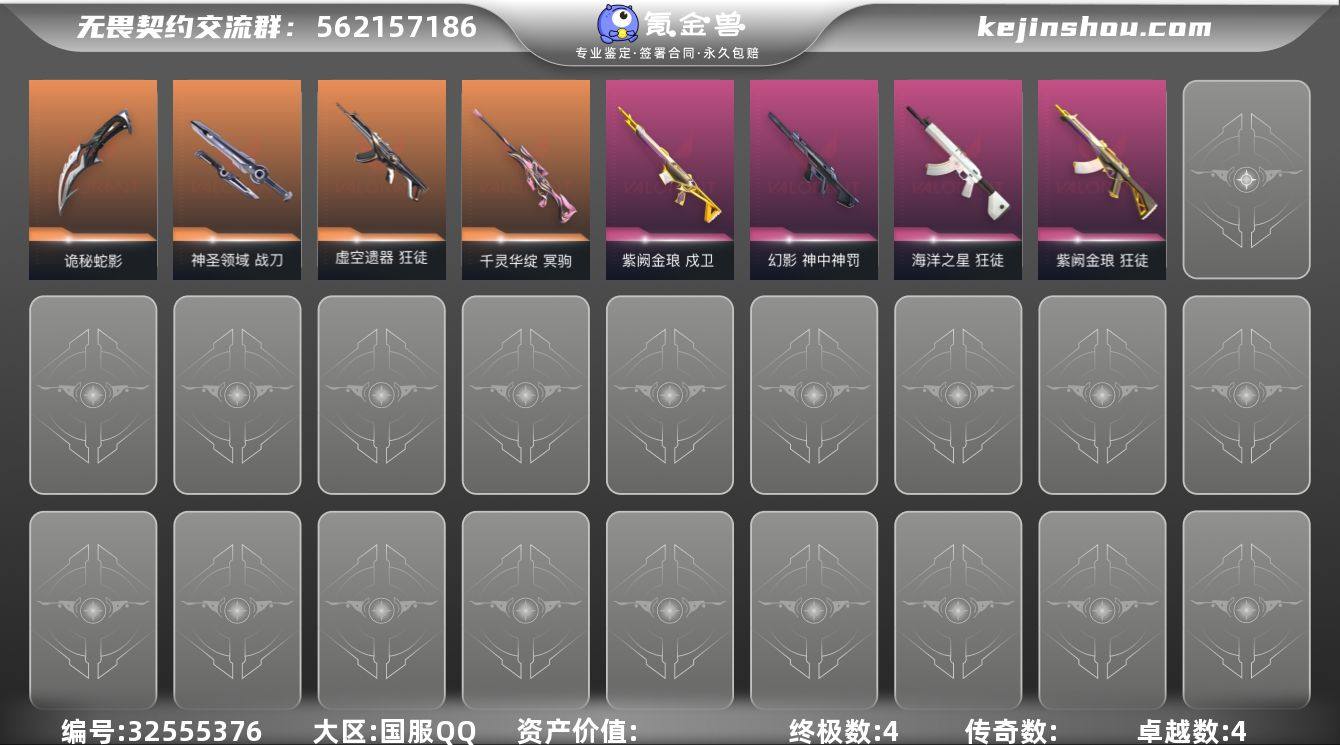 【18】【英雄】:幻棱,炼狱,维斯,暮蝶,钛狐,壹决,铁臂,捷风,雷兹,幽影,不死鸟,贤者,猎枭,蝰蛇,零,芮娜,奇乐,尚勃勒,霓虹,斯凯,夜露,星礈,K/O,海神,盖可,黑梦,钢锁 【近战武器】:近战武器-诡秘蛇影 军刀,近战武器-神圣领域 战刀 【狂徒】:狂徒-虚空遗器,狂徒-海洋之星,狂徒-紫阙金琅,狂徒-诡秘蛇影 【幻影】:幻影-神中神罚,幻影-神圣领域,幻影-末日之翼 【戍卫】:戍卫-紫阙金琅,戍卫-月球哨兵,戍卫-折光棱晶 【獠犬】:獠犬-神圣领域 【冥驹】:冥驹-千灵华绽,冥驹-星云暗涌 【飞将】:飞将-末日之翼 【莽侠】:莽侠-诡秘蛇影,莽侠-月球哨兵 【战神】:战神-神圣领域 【奥丁】:奥丁-末日之翼 【判官】:判官-诡秘蛇影 【雄鹿】:雄鹿-月球哨兵 【骇灵】:骇灵-星云暗涌 【蜂刺】:蜂刺-星云暗涌,蜂刺-折光棱晶 【标配】:标配-折光棱晶 【正义】:正义-纳米打击,正义-月球哨兵 【鬼魅】:鬼魅-诡秘蛇影,鬼魅-星云暗涌 【狂怒】:狂怒-神圣领域 【短炮】:短炮-末日之翼 【卡面】:终章:激斗汉堡 卡面,进入射程 卡面,精灵大战 卡面,南瓜盛典 卡面,正义的化身 卡面,最高舞台 卡面,归乡 // 蝰蛇 卡面,梦幻奶茶 卡面,零点嗅...
