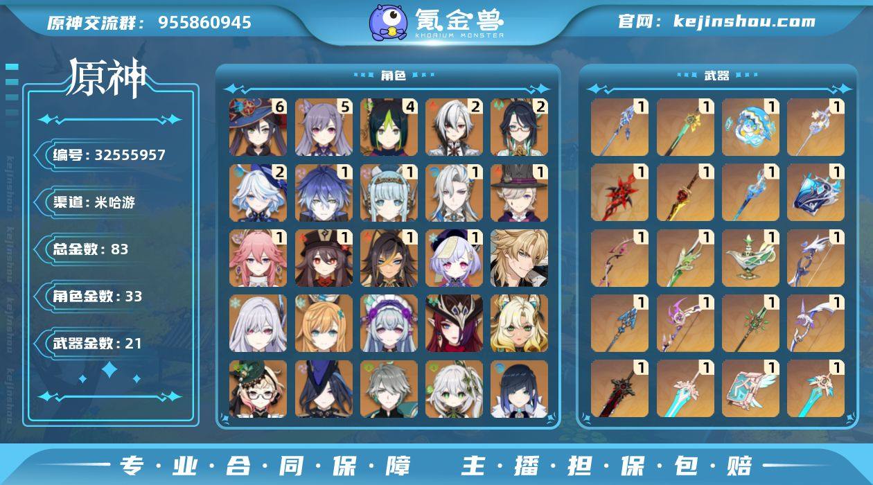 83黄! 月感电战舰!冰水战舰!龙芙万希!2+1仆人!2+1芙宁娜!1+1菲林斯!1+1伊涅芙!1+1龙王!满命莫娜!冒险等级: 60 6命金色角色: 满命莫娜 5命金色角色: 五命刻晴 4命金色角色: 四命提纳里 2命金色角色: 二命芙宁娜,二命闲云,二命阿蕾奇诺 1命金色角色: 一命七七,一命胡桃,一命八重神子,一命迪希雅,一命林尼,一命那维莱特,一命伊涅芙,一命菲林斯 0命金色角色: 迪卢克,温迪,枫原万叶,宵宫,钟离,琴,魈,雷电将军,夜兰,纳西妲,艾尔海森,克洛琳德,艾梅莉埃,希诺宁,恰斯卡,梦见月瑞希,爱可菲,丝柯克,法尔伽 拥有武器: 狼的末路,飞雷之弦振,天空之卷,和璞鸢,阿莫斯之弓,天空之傲,天空之刃,息灾,若水,千夜浮梦,裁叶萃光,最初的大魔术,万世流涌大典,静水流涌之辉,有乐御簾切,赤月之形,柔灯挽歌,冲浪时光,岩峰巡歌 1精武器: 狼的末路,飞雷之弦振,天空之卷,和璞鸢,阿莫斯之弓,天空之傲,天空之刃,息灾,若水,千夜浮梦,裁叶萃光,最初的大魔术,万世流涌大典,静水流涌之辉,有乐御簾切,赤月之形,柔灯挽歌,冲浪时光,岩峰巡歌,血染荒城