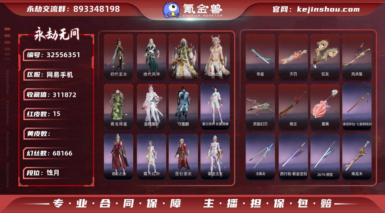 【红皮】:墨离(飞索皮肤),初代玄女(宁红叶皮肤),绝代风华(迦南皮肤),青龙将星(岳山皮肤),灵狐幻刃(太刀皮肤),狼主(阔刀皮肤),凤求凰(双刀皮肤),狂龙(双节棍皮肤),化生明王(天海皮肤),泣珠龙纱(崔三娘皮肤),天罚(火炮皮肤),守墨麒(张起灵皮肤),星辉魔纱(沈妙皮肤),帝星(横刀皮肤) 【外观总数】15红 496金 幻丝:68166金砖: 收藏值:31W 【段位】:单排: 双排: 三排: 【换绑】:可换绑,期间登录网易大神不影响正常游戏,其他皮肤可参考以下截图,道具、段位以实际验号为准,段位因赛季原因发生变化,以上号为准"