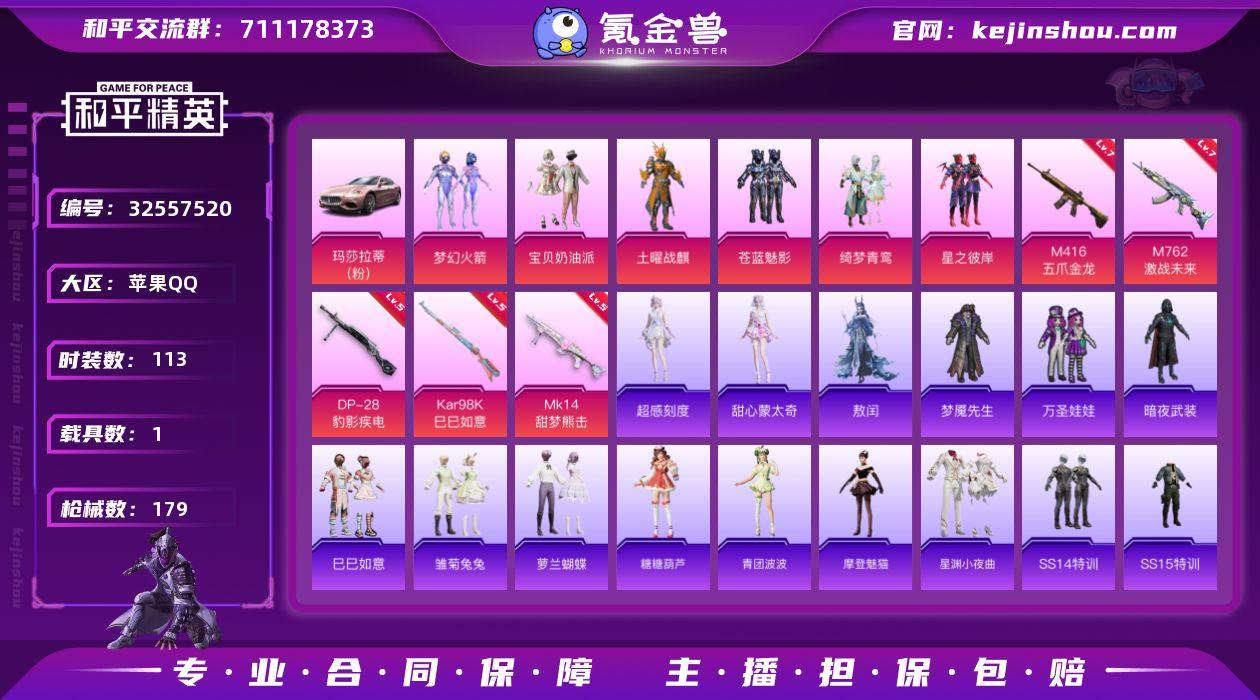 【kyhp877】苹果 手Q-6粉装-6特效枪-1载具-4粉色飞行器-54210热力值-2王牌印记-113套装-179枪皮 【热门品类】:粉装-梦幻火箭,套装-SS1特训 【粉色套装】:粉装-宝贝奶油派,粉装-土曜战麒,粉装-梦幻火箭,粉装-苍蓝魅影,粉装-绮梦青鸾,粉装-星之彼岸 【粉色枪皮等级】:M416-五爪金龙(七级),M762-激战未来(七级),Kar98K-巳巳如意(五级),Mk14-甜梦熊击(五级),Mk14-福马献瑞(五级),DP-28-豹影疾电(五级) 【粉色载具】:玛莎拉蒂Ghibli(粉) 【粉色枪皮】:M416-五爪金龙,M762-激战未来,Kar98K-巳巳如意,Mk14-甜梦熊击,Mk14-福马献瑞,DP-28-豹影疾电 【粉色飞行器】:炫彩糖果飞行器,梦幻火箭飞行器,绮梦青鸾飞行器 【粉色降落伞】:绝对恒星降落伞,梦幻火箭降落伞,银刃赛罗降落伞,洛神天依降落伞,精灵梦叶罗丽降落伞,星梦奇缘降落伞,拳皇·狂花道降落伞,异瞳寒姬降落伞,极意拳锋降落伞,炫彩糖果降落伞 【稀有套装】:套装-巳巳如意,角色-超感刻度,角色-甜心蒙太奇,套装-炫彩糖果,套装-马上有钱,套装-雏菊兔兔,套装-萝兰蝴蝶,套装-糖糖葫芦,套装-青团波波,角色-摩登魅猫,套装-星渊小夜曲,角色-敖闰,套装-雨过天青,套装-红釉青花 【稀有枪...