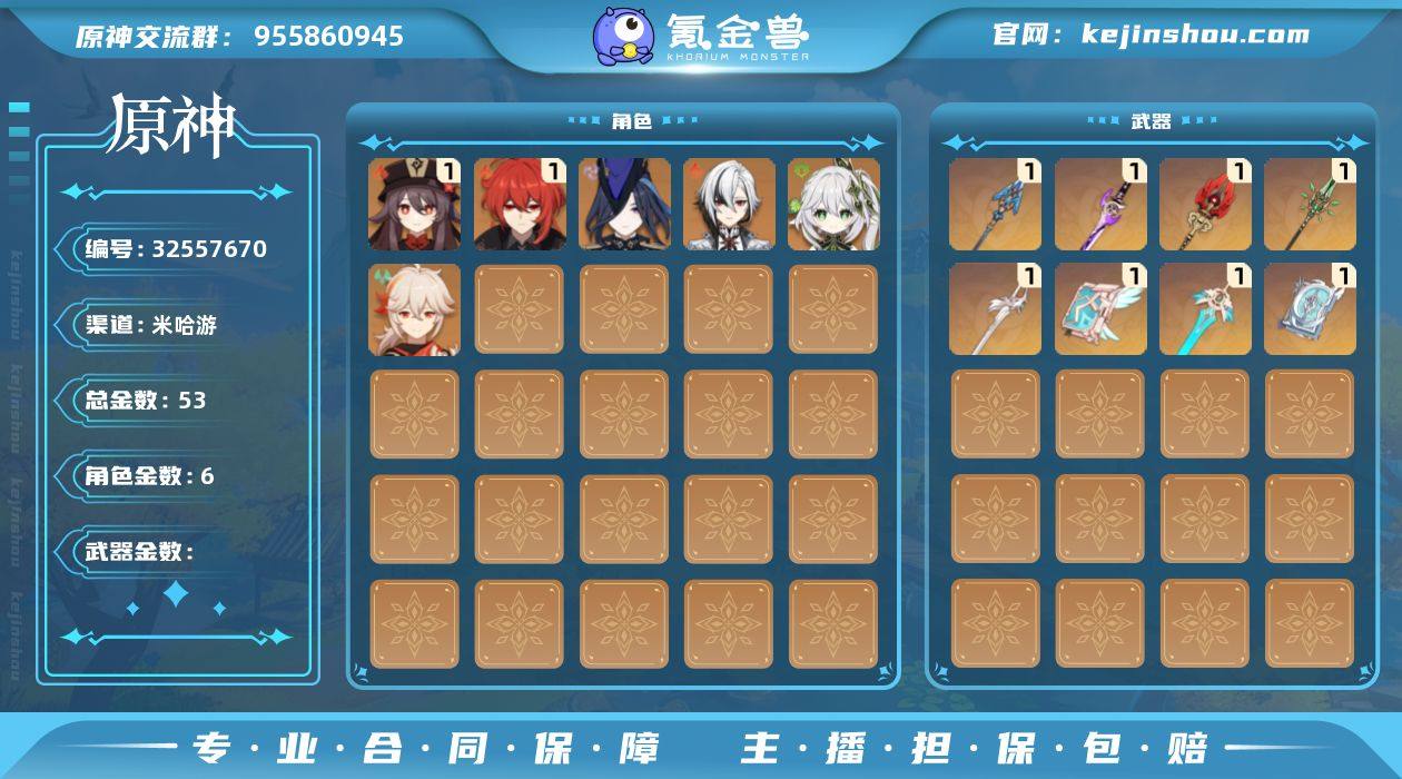 53黄 风元素:0命枫原万叶, 0命闲云 火元素:0命阿蕾奇诺, 1命胡桃, 0命可莉 水元素:6命哥伦比娅, 1命夜兰 雷元素:0命菲林斯, 0命克洛琳德, 0命雷电将军 冰元素:0命茜特菈莉 岩元素:0命娜维娅 草元素:0命纳西妲 【常驻五星角色及命座】 风元素:2命琴 火元素:1命迪卢克, 1命迪希雅 水元素:4命莫娜 雷元素:1命刻晴 草元素:6命提纳里 单手剑:精1天空之刃, 精1雾切之回光, 精1风鹰剑 长柄武器:精1和璞鸢, 精1息灾, 精1护摩之杖, 精1赤月之形 法器:精1四风原典, 精1四风原典, 精1天空之卷, 精1帷间夜曲 【角色皮肤】 五星角色:胡桃-宿雪桃红 四星角色:香菱-岁夜欢哗, 丽莎-叶隐芳名, 凯亚-帆影游风, 绮良良-倩影游侠, 行秋-雨化竹身