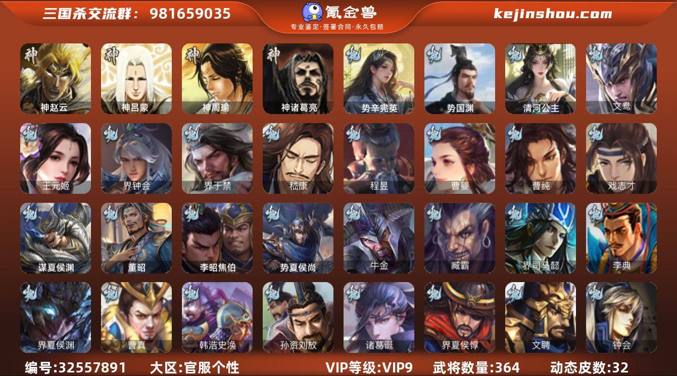 【14789705】官阶:大将军;VIP等级:VIP9;史诗武将数量:39;动态皮肤数量:32;武将总数:364;史诗宝珠数量:5;将魂数量:2704;神将:2;魏国史诗武将:22;蜀国史诗武将:11;吴国史诗武将:6;群史诗武将:12