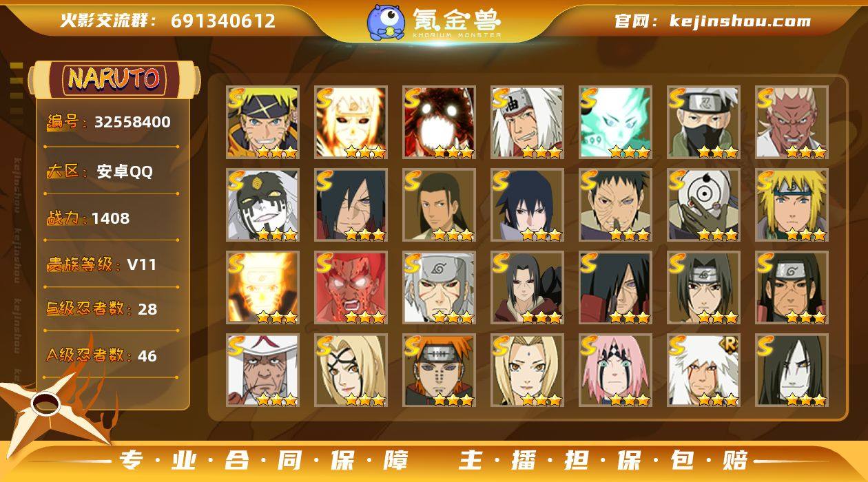 0B9S3W 号 VIP11,1408W战力,S忍30个,A忍52个,本服前500,战区未上榜,通灵兽22个,7时装,点券0,金币14445,高招券2,上忍1阶,忍者星数591