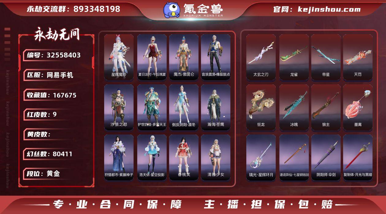 【红皮】:墨离(飞索皮肤),冰魄(长剑皮肤),狼主(阔刀皮肤),狂龙(双节棍皮肤),天罚(火炮皮肤),星辉魔纱(沈妙皮肤),帝星(横刀皮肤),龙雀(阔刀皮肤),太玄之刃(太刀) 【外观总数】9红 230金 幻丝:80411金砖: 收藏值:16W 【段位】:单排: 双排: 三排: 【换绑】:可换绑,期间登录网易大神不影响正常游戏,其他皮肤可参考以下截图,道具、段位以实际验号为准,段位因赛季原因发生变化,以上号为准"
