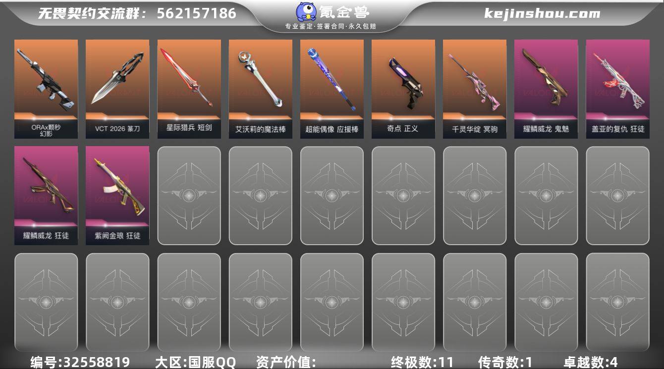 【套装】:VCT 2026 赛季套装,耀鳞威龙套装 【英雄】:幻棱,炼狱,维斯,暮蝶,钛狐,壹决,铁臂,捷风,雷兹,幽影,不死鸟,贤者,猎枭,蝰蛇,零,芮娜,奇乐,尚勃勒,霓虹,斯凯,夜露,星礈,K/O,海神,盖可,黑梦,钢锁 【近战武器】:近战武器-VCT 2026 篆刀,近战武器-穿花蝴蝶,近战武器-紫金爪刀,近战武器-艾沃莉的魔法棒,近战武器-威龙之刃,近战武器-鬼丸国纲,近战武器-超能偶像 应援棒,近战武器-星际猎兵 短剑 【狂徒】:狂徒-盖亚的复仇,狂徒-耀鳞威龙,狂徒-紫阙金琅,狂徒-超能偶像 【幻影】:幻影-ORA x 颗秒,幻影-聚合之力 【戍卫】:戍卫-超能偶像 【獠犬】:獠犬-采蜜小蜂队 【冥驹】:冥驹-千灵华绽 【飞将】:飞将-聚合之力 【战神】:战神-采蜜小蜂队 【判官】:判官-超能偶像,判官-采蜜小蜂队 【蜂刺】:蜂刺-聚合之力 【标配】:标配-超能偶像 【正义】:正义-奇点,正义-超限闪存,正义-纳米打击 【鬼魅】:鬼魅-耀鳞威龙,鬼魅-采蜜小蜂队,鬼魅-星云暗涌 【狂怒】:狂怒-聚合之力 【短炮】:短炮-好搭档 【卡面】:终章:激斗汉堡 卡面,进入射程 卡面,《双城之战》拥抱 卡面,精灵大战 卡面,欢迎来到底城 卡面,南瓜盛典 卡面,唱...