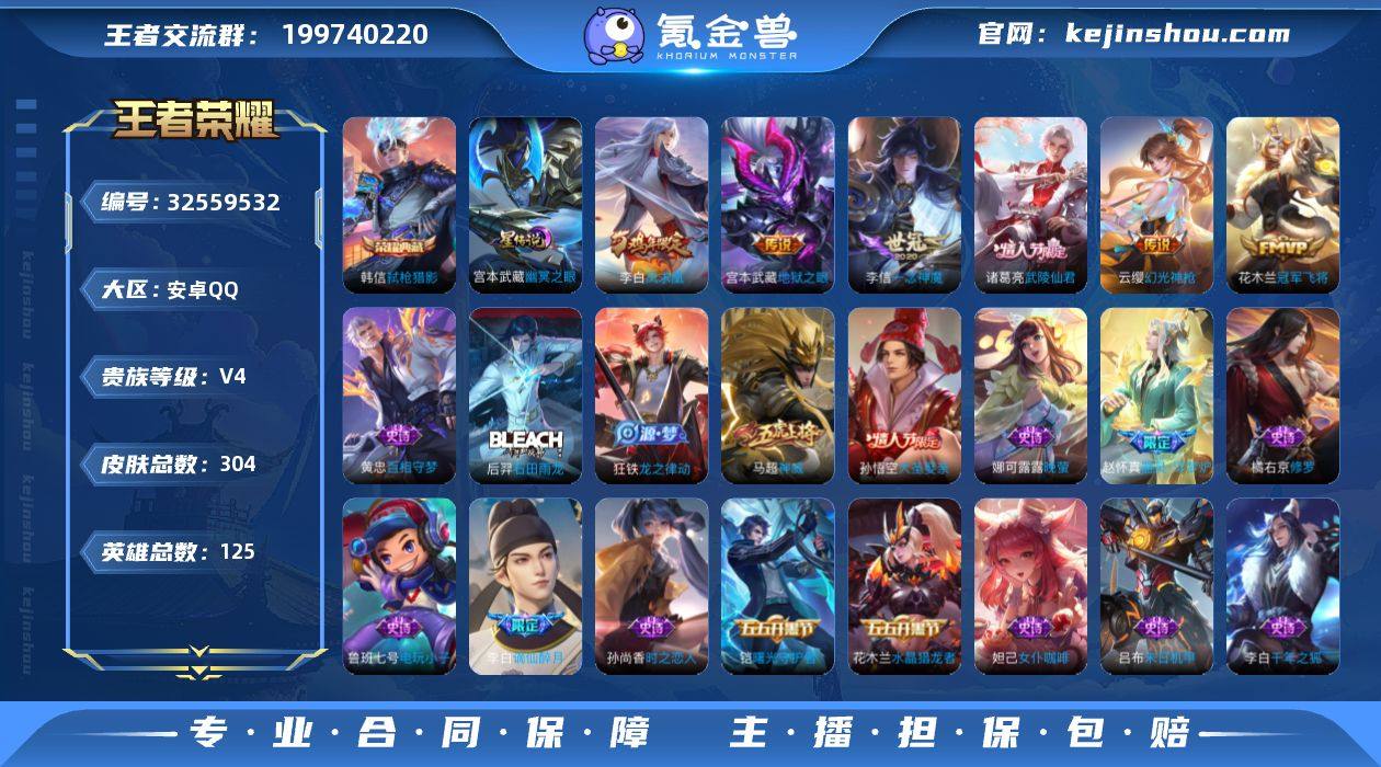 ·万灵伏威·霜北刀·一念神魔·武陵仙君·凤求凰·冠军飞将·无二次包过】w20777-安卓Q-125英雄-304皮肤-25王者印记-300铭文-贵族积分2w【贵族4】【1典藏·1星传说·10传说·1天幕·7按键】【因赛季更新游戏段付以上号为准!】 【英雄全皮】:孙权全皮,盾山全皮 【荣耀典藏】:韩信弑枪猎影 【星元皮肤】:宫本武藏幽冥之眼 【天幕】:共赏芳华天幕 【传说皮肤】:后羿神树通天,曹操万灵伏威,云缨幻光神枪,桑启鸣野蒿,夏侯惇霜北刀,李信一念神魔,花木兰冠军飞将,诸葛亮武陵仙君,李白凤求凰,宫本武藏地狱之眼 【限定皮肤】:白起狰,夏侯惇霜北刀,大乔绒语心约,姜子牙天穹之誓,李白谪仙醉月,狄仁杰阴阳师,虞姬凯尔特女王,赵云皇家上将,嬴政优雅恋人,孙尚香蔷薇恋人,鲁班七号狮舞东方,庄周高山流水,高渐离死亡摇滚,钟无艳王者之锤,芈月重明,元歌无心,夏侯惇朔风刀,甄姬游园惊梦,曹操烛龙,典韦穷奇,狄仁杰魔术师,狄仁杰万华元夜,达摩沙漠行僧,项羽海滩派对,老夫子醍醐杖,程咬金演武夺筹,韩信飞衡,兰陵王金庭之子,花木兰默契交锋,孙悟空大圣娶亲,牛魔御旌,李元芳云中旅人,虞姬霸王别姬,钟馗神迹守卫,钟馗驱傩正仪,杨玉环遇见飞天,雅典娜单词大...