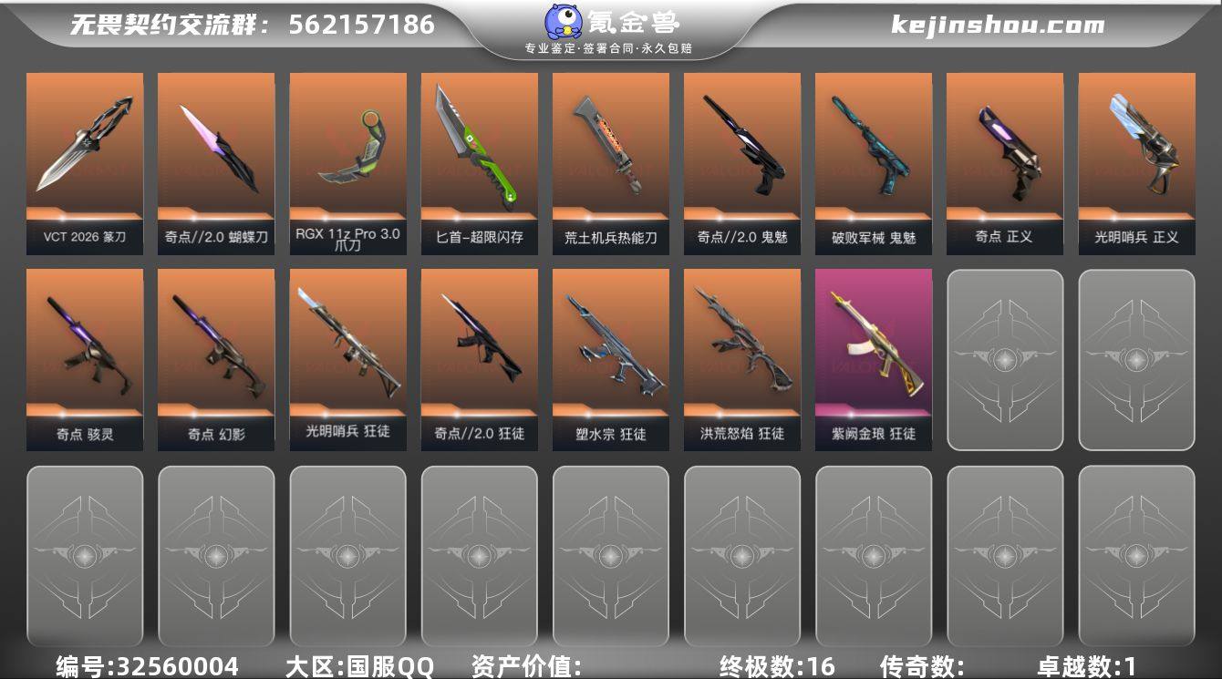 【PTWW3277】终极*16/卓越*1/皮肤*49/等级*61/段位:未定级/VCT 2026 赛季套装/奇点//2.0套装/奇点套装/炼狱/维斯/暮蝶/壹决/铁臂/捷风/幽影/不死鸟/贤者/猎枭/芮娜/尚勃勒/霓虹/斯凯/K/O/盖可/VCT 2026 篆刀/蝴蝶刀-奇点//2.0/爪刀-RGX 11z Pro 3.0/落英飞旋/匕首-超限闪存/荒土机兵热能刀/狂徒-光明哨兵/狂徒-洪荒怒焰/狂徒-奇点//2.0/狂徒-塑水宗/狂徒-紫阙金琅/狂徒-荒土机兵/幻影-奇点/幻影-超限闪存/幻影-纳米打击/戍卫-浮光跃金/戍卫-逆冲蛮牛/獠犬-模拟赫兹/獠犬-逆冲蛮牛/冥驹-荒土机兵/冥驹-模拟赫兹/莽侠-超限闪存/战神-浮光跃金/奥丁-纳米打击/判官-纳米打击x/雄鹿-模拟赫兹/雄鹿-逆冲蛮牛/骇灵-奇点/骇灵-荒土机兵/骇灵-浮光跃金/蜂刺-超限闪存/标配-荒土机兵/标配-浮光跃金/正义-光明哨兵/正义-奇点/正义-超限闪存/正义-纳米打击/鬼魅-破败军械/鬼魅-奇点//2.0/鬼魅-模拟赫兹/狂怒-逆冲蛮牛/终章:激斗汉堡 卡面/进入射程 卡面/分崩离析 卡面/纳米打击 卡面/抑制技术 卡面/激斗汉堡 卡面/瓦娃脸雪糕 P2 卡面/从黄昏到黎明 卡面/荒土机兵 卡面/银弹猎手 卡面/逆冲蛮牛 卡面/《双城之战》拥抱 卡面/精灵大战 卡面/欢迎来到底城 卡面/南瓜盛典 卡面/唱片的故事 卡面...