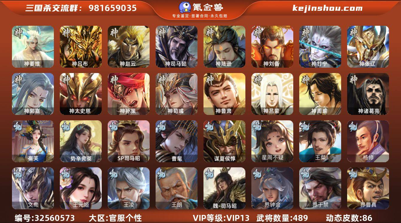 VIP等级: VIP13 官阶: 大将军 武将数量: 489 动态皮肤数量: 86 神将: 神甘宁,神郭嘉,神刘备,神陆逊,神吕布,神司马懿,神孙策,神太史慈,神荀彧,神张辽,神赵云,神吕蒙,神周瑜,神诸葛亮,神姜维,神鲁肃 魏国武将: 刘晔,戏志才,曹纯,曹婴,陈琳,程昱,郝昭,嵇康,界曹真,界于禁,界钟会,魏-司马昭,王朗,王凌,王元姬,文鸯,杨修,王粲,唐咨-魏,张辽,SP蔡文姬,SP曹仁,SP关羽,SP贾诩,SP姜维,SP庞德,卞夫人,蔡贞姬,曹昂,曹操,曹冲,曹洪,曹丕,曹仁,曹叡,曹嵩,王异,张恭,鲁芝,界满宠,曹休,界曹植,满宠,荀攸,王基,钟繇,蒯越蒯良,郭嘉,牵招,荀彧,阮慧,杜畿,界郭嘉,崔琰,界曹丕,界荀彧,朱灵,界甄姬,辛毗,吕虔,界王异,界许褚,界郭淮,华歆,陈群,界邓艾,界典韦,界曹休,袁涣,李通,乐进,辛宪英,郭淮,毛玠,界曹彰,郭皇后,毌丘俭,夏侯惇,曹植,司马朗,谋于禁,界曹操,星周不疑,许褚,界张辽,谋徐晃,张郃,钟会,文聘,曹彰,界夏侯惇,诸葛诞,司马懿,甄姬,杨阜,界徐晃,徐晃,界曹仁,孙资刘放,韩浩史涣,胡班,曹真,典韦,界夏侯渊,夏侯渊,李典,于禁,王双,邓艾,界司马懿,张春华,孟达-魏,臧霸,牛金,朱灵(国战),谋夏侯惇,曹髦,SP司马昭,司马伷,董昭,谋郭嘉,谋夏侯渊,势辛宪英,崔芙 蜀国武将: 董允,关索,花鬘,界黄忠,谯周,...